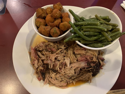 Read moreDecided to try this BBQ place, the decor looks good. I was seated inside and took a while for the waitress to take my order, she kept walking by with one excuse after another why she didn’t take my order. When she did stop to take my order, I started telling her what I wanted and she interrupted me to tell me she forgot her pen and left again. When she came back, I had to start over. I ordered a beer and it was room temperature. For the meal, I ordered the small pork plate with fried okra and the green beans. When the meal arrived, the pork was so watered down the bowls with the okra and beans were sitting in it and I had to send it back for a different plate of pork. That time it wasn’t watered down. I mentioned to one of the employees and was told it was a sauce in the pork. The BBQ sauces were ok, one tasted like fancy ketchup. I know from experience that some restaurants water down the meat when it has been cooked several day before to try to moisten it up, plus the pork had a somewhat smoke flavor but no real flavor like a rub. You can see from the pictures of what I’m talking about. All and all, the green beans were the best out of the whole meal. If you plan to visit the restaurant, call ahead to find out what days they are smoking the pork and go that day, I’m sure the flavor will be better than days of old BBQ. I gave them two stars for the green beans, the rest I would...