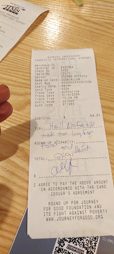 This place needs to be boycotted. The fact that it is located in the Charlotte Airport, it maintains customers. I visited this location for the first time, of course, due to flight delay, and it makes limited choices for dinner. Long wait time for seating even though tables were available but not cleared from previous diners. Finally sat down ordered a simple rum and coke waiting 15 minutes only to have the waiter take time to bring to the table, saw it was made but just sitting there with no urgency to bring it and it wasn't correct. I ordered my food only to wait an extremely long time. The couple next table sat down after me ordered their food and drinks paid and left. My food came in to go box, I didn't order to go. So why not in regular dishes? See the photo of the tip left. This is a management issue lack of care. Boycott Boycott boycott. The only bright side, one of the bartender made an effort to help seat seeing the hostesses overworked trying to get customers seated. #POOR...