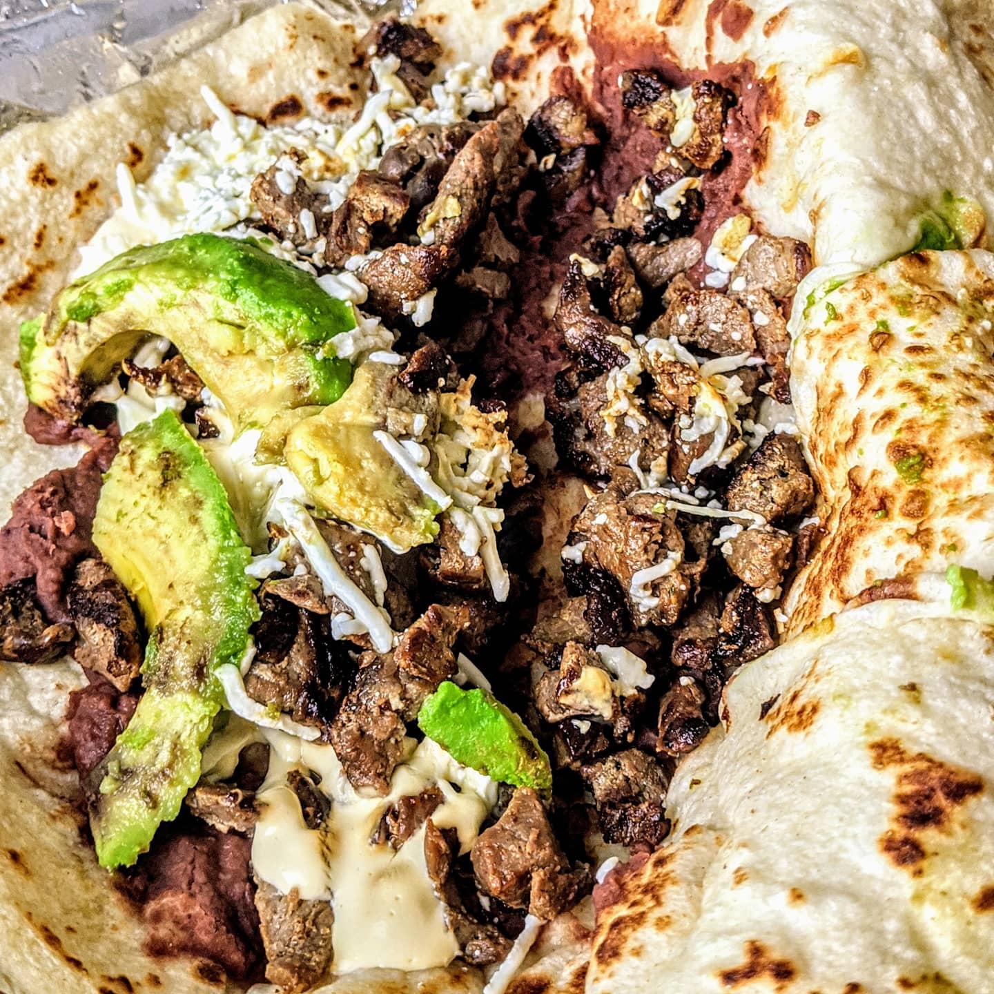 We got way too much food and I'm still in a food coma. We ordered a pork and cheese Pupusa, Baleada #5, chorizo tacos, the Salvadoran steak, tres leches, and horchata.