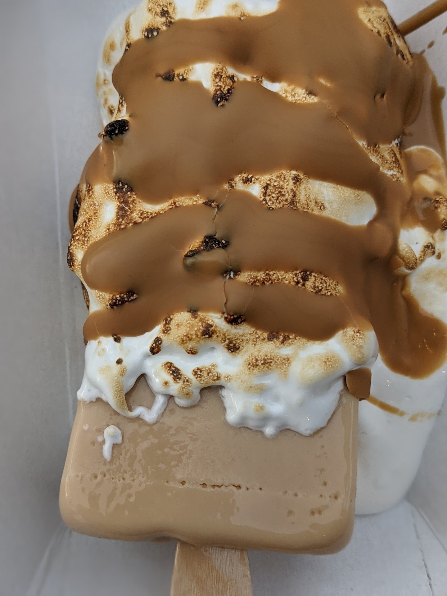 We got a dulce de leche filled with dulce de leche and strawberry filled with condensed milk paleta. We got both topped with s'mores (marshmallow fluff) and a cookie butter drizzle.