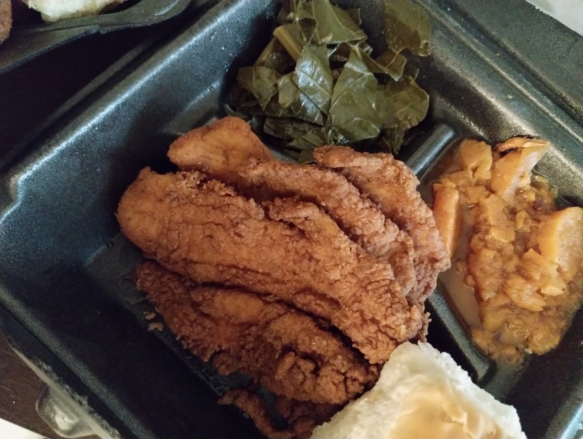 Ā Ā Ā Read moreI'm stuck. Soooo I ate the food in prayer.. #1 the overall appearance of the restaurant was dirty but the young man that took my order was so nice like really really nice! But I cant shake the fact that soooooooo many things went wrong in a matter of me being there... so when I walked in I witnessed another male employee come out of the back to talk to the man that was preparing food and they were pretty close to the fryer, the guy that came out took his cap off and proceeded to scratch is hair with his cap by the fryeršš§.. then almost immediately after I witnessed that..the man that was preparing food with gloves on pulled up his pants which didnt appear to be that clean and did not change his gloves... now he was preparing someone's else's food so I didnt flip(sorry person, I'm having so many thoughts as I type OMG) but then he went to the back got a cleaning RAG and proceeded to wipe down almost everything near him and then attempted to make what was my order without changing his gloves..I stopped him and asked him to change his gloves and it wasn't a problem for him to do so(nice people).. the only person that had a problem was a nosey, disrespectful, nothing better to do female customer that felt compelled to "school" me on her version of food handling and sanitation.. however she didnt see all of what I saw she just heard when I asked for gloves to be changed. like I said I'm stuck. Nice people but unsanitary food handling and dirty(black dust accumulation) up front. Like I said I ate some of my food.(30.00 GONE! first and last visit) But something told me to stop. This is upsetting because I liked the yams.. but i won't be back just for peace of mind.. if that's what i saw in in front .. what's happening in the back.. OH YEAH.. there was a forth man that came out the back with no gloves on and put a piece of meat in the fryer and dropped it down. So yea I'm done. Such a shame though. They need that show Restaurant Impossible to come help.. you know out of all of this I didnt even stop to see what the sanitation score was. Crazy huh. Anyway bye...