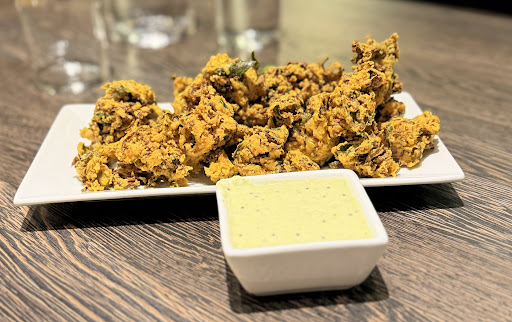 We started with the Brussel Sprout Pakora. Imagine brussel sprout leaves coated in a spiced chickpea batter, fried golden, and piled high like crispy little flavor clusters. It came with a cool dipping sauce that wasnât my favorite but balanced the pakora. If you ask for tamarind chutney instead, this dish might just level up.