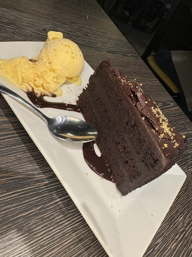 For dessert, I caved when I saw a nearby table digging into cake. The Death by Chocolate arrived as a rich, layered monster of fudge, frosting, ganache, and chocolate shavings with a generous scoop of vanilla ice cream on the side. Not made in-house, but sourced from a French bakery, which means no sad frozen Sysco cake here.
