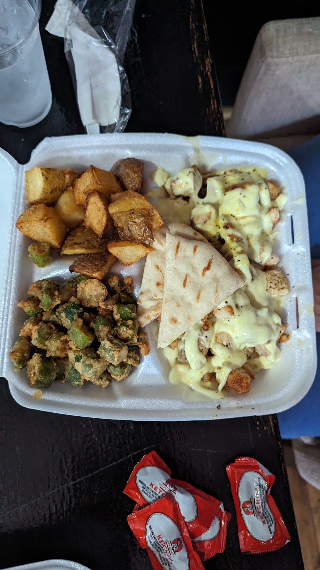 I normally get the same sides when I go too. I order the roasted potatoes and the fried okra. With the lemon pepper chicken, I always get the sauce on the side and use it more as a dip. I find that the sauce can be a little over powering if it’s poured onto the chicken. This way I can flavor it as needed.