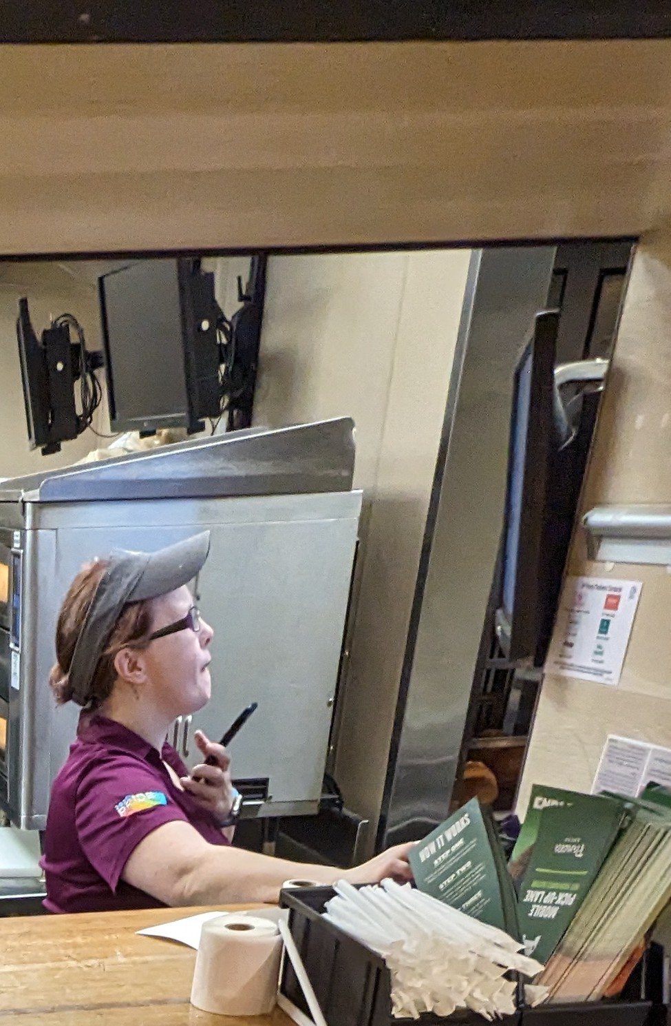Read moreFirst time at this location (we live in SC and just got off of a flight) and we were slightly disappointed. When we walked in there was a line but the cashier seem to be just standing there. No smile, no greeting, nothing. We decided to order from the kiosk which was easy to navigate. Once we placed our order I waited to hear my name to be called. There were several people standing at the pick up window so I stood with them waiting. The kitchen was very busy but well run by a gentleman with a beard. He was putting orders up as they were being made. Sadly he had to stop what he was doing to tell the cashier to stop standing around and clean tables on her down time. She pushed through the crowd without saying anything and the look on her face made it seem like she did not want to work there. She just stood at the pick up window tapping her finger nails on the counter. A few people approached and tried to ask her a question, she just shrugged and said she didn't know. Look, if you hate your job, I get it but at least act polite to your customers. Big shout out to the kitchen staff for being hit with 2 teams and still getting orders out. Our food was awesome...