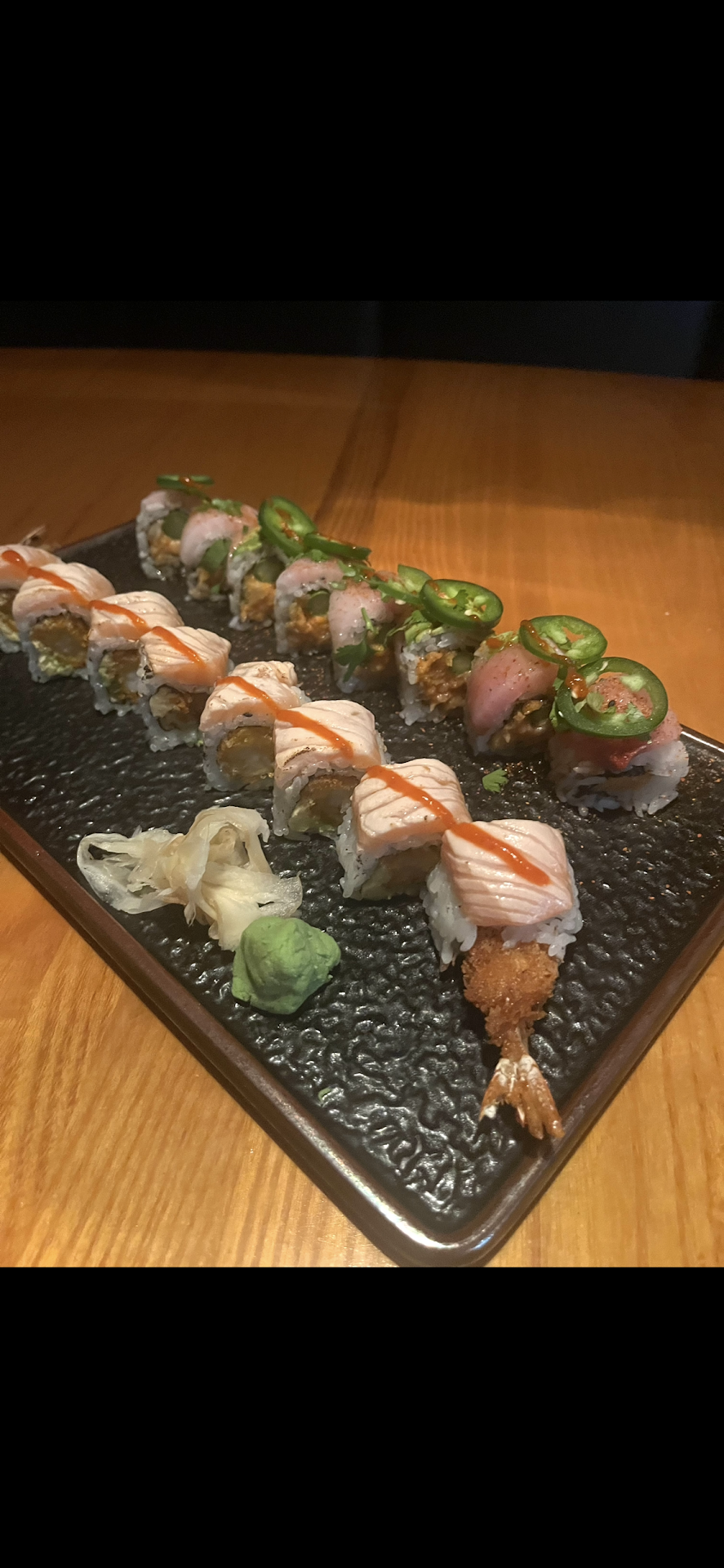 The sushi came out quickly. The sushi is generally served on several large plates. Our waitress told us that she tried to make sure that what we ordered was in front of us, but that she was unable to make it perfect. In fact, most of the sushi that the people on my half of the table ordered was on the otherside of the table. Our waitress asked us if we would like her to explain the which sushi was which. Seeing that the sushi was mixed up, I said, "Yes", to which she responded in an exasperated tone, "All of them?!?!" I thought she was volunteering to explain, but apparently not.