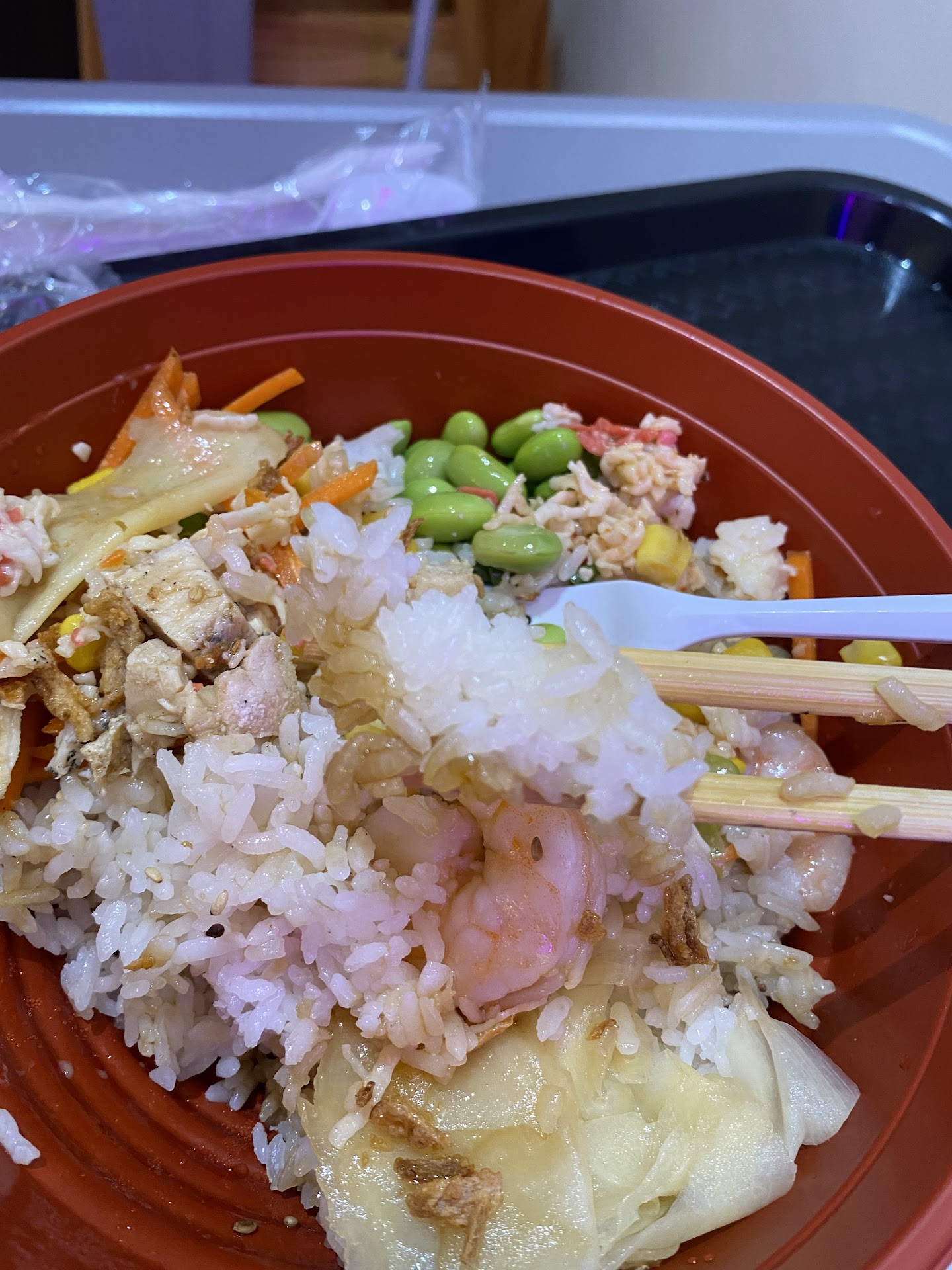 The poke bowl consisted mostly of rice, and the toppings were served with a bartender’s mixing spoon, resulting in very small portions.