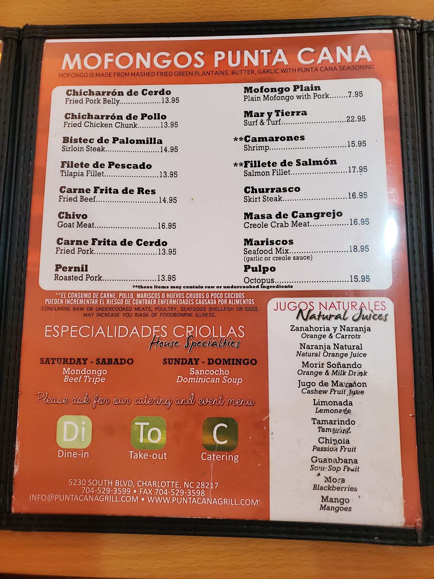 To start of the meal, I ordered a Quipe and a Pastelito. Both were completely forgettable and very over priced for what you get. What helped the first bad impression take a step towards the right direction were their juices, especially the Morir Soñando drink. I ABSOLUTELY loved it. In addition to that drink, I also tried their Marañon and Chinola juice. The former was not nearly as good or as refreshing as the latter. But that has to do more with personal taste than anything else. I would seriously drive out to this place just for the drinks. I then tried their stewed goat and one of their Mofongos. The stewed goat , which came with rice and plantains (your choice of sides), was a huge letdown. Nothing in that dish was savory or impressive. I found the rice to be a tad bit dry for my taste and the plantains were nothing to write home about. What really shocked me were the lack of flavors in the goat. It was not tender, it was not juicy, and it was not flavorful. The only thing that left an impression in my mind is how oily it tasted. My experience would have ended on a bad note had it not been for the Mofongo. This dish was magical! First of all, wonderful presentation! But what really made it impressive was the variety and complexity of the flavors/textures in this one dish. You are first greeted with what looks like a mountain of meat, which is already a treat in itself, but upon further investigation you discover that the meat is concealing a layer of plantains, which in turn, is concealing another layer of meat, in our case, pork. Every bite is a delight. You experience a plethora of flavors that are enhanced the deeper you dig in. This is a must try!