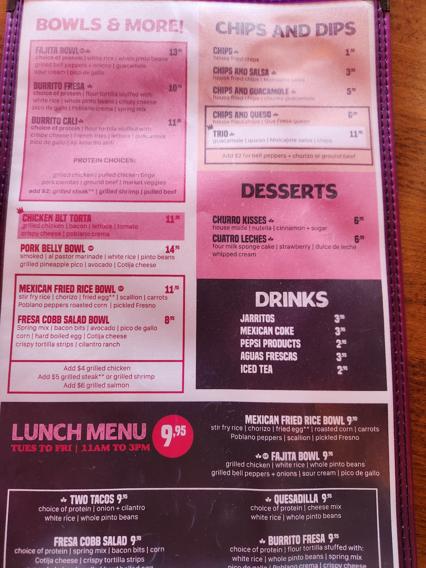 Read moreI was recommended this restaurant by a friend who sent me an instagram story highlighting their soft serve margaritas. my family is from Raleigh but we happened to be traveling to Charlotte so we decided to stop in for lunch on the premise of those soft serve margaritas alone. Absolutely everything about this restaurant was a delight! We shared some of the strawberry margaritas, which were so refreshing after a hot day sightseeing. We order a variety of food; burrito, fajita bowl, fried rice bowl, and I got a chicken blt torta. All of the food was delicious! We were all raving to each other about it as we ate. I love tortas and its not often available at a lot of restaurants so I was very excited to see it on the menu. This is easily one of the best tortas I've had! The cheese brought an exciting element to the mix and every ingredient was so flavorful. The portions are generous, and well priced too! Four entrees (some lunch priced, some not), two soft serve margaritas, and a chips and queso appetizer came to about $75 before tip. The margaritas were $10 each so the food itself was $55. Not bad for feeding four hungry people!