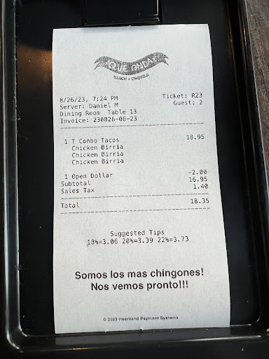 Read moreThis was one of the worst experiences. My friend and I split three chicken birria tacos with rice and street corn. Originally, we asked if it was possible to just get the tacos but we were informed the sides were not optional which was fine. We ate the tacos first and they were great. However, we then moved on to the corn and as my friend took exactly two bites of corn, on her second bite, a long strand of hair was hanging from her mouth. We let the waiter know who then left abruptly, came back, said he let a manager know and said he could only take $1 off the meal. After we informed him we didnât feel that was reasonable he then brought the alleged manager and another person to the table. At this point there are three people around our table examining the corn and telling us how everyone wears hats and my friend had informed him that she understood that, but there was still a hair in her food with those precautions. The âmanagerâ then told her that she shouldnât have waited until the end to say anything when the only thing ate were three tacos. The rice was still fully there as well as a cob with two bites taken out. As stated beforehand, the tacos were eaten first. Once she saw the hair wrapped around the corn hanging from her mouth, we stopped eating. If he was the manager, because it was never disclosed who was who, he was very condescending and lacked compassion as a whole. He essentially made it seem like we just wanted to eat everything and receive a free meal which was never the case considering 1/3 of the meal was eaten. He proceeded to comp only $2 of the $18 meal. After taxes, we only paid .60 less than what we normally wouldâve paid. The customer service from whoever this was set the tone as whole and i would never return nor recommend anyone else. What good is the food if youâre treated like you are...