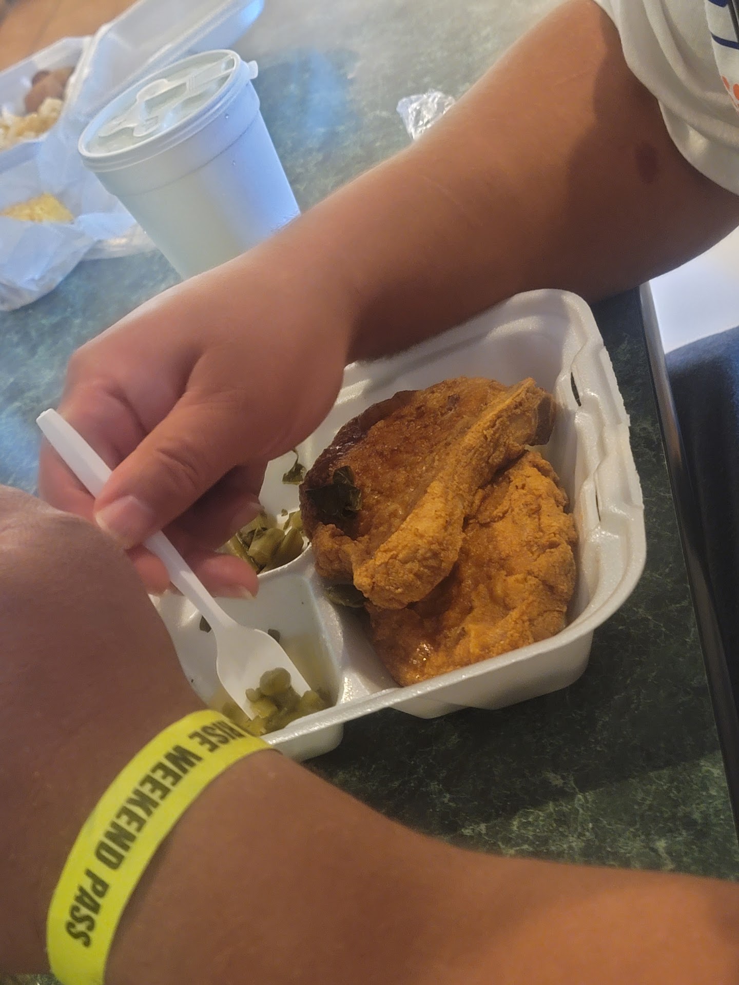 Food served cafeteria style - still ok for a soul food joint / HOWEVER upon ONE bite, I could tell the food was not fresh and had the aftertaste of being in that container for more than a day - did I mention also no seasoning? I mean everything tasted as if it was in leftover phase - and not just yesterday’s - and lacked enough proper seasoning to masquerade the back taste. After trying 1-2 bites of each meat and side, I threw it ALL away bc I really feared getting sick as that after taste only got stronger.