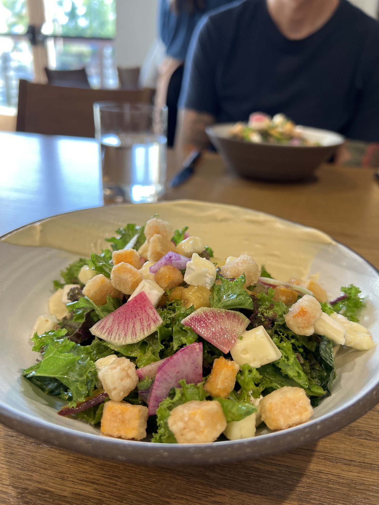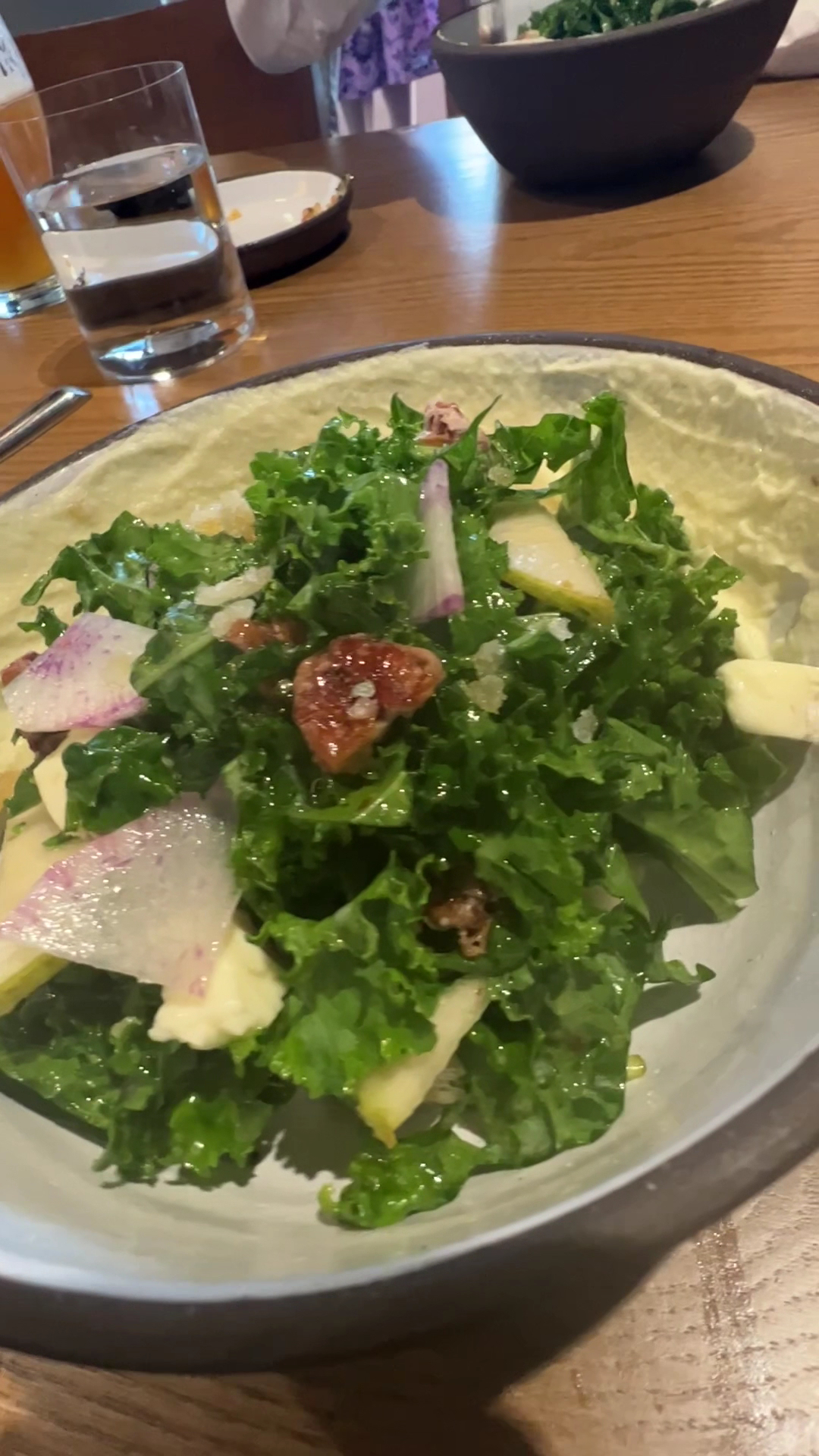 We split the kale salad. It was very good but a bit too sugary for me. I would have loved something a bit more savory/salty to balance it. The cheese was grassy and the greens were very flavorful.The sweet potato croutons were not crunchy but I appreciated the effort.