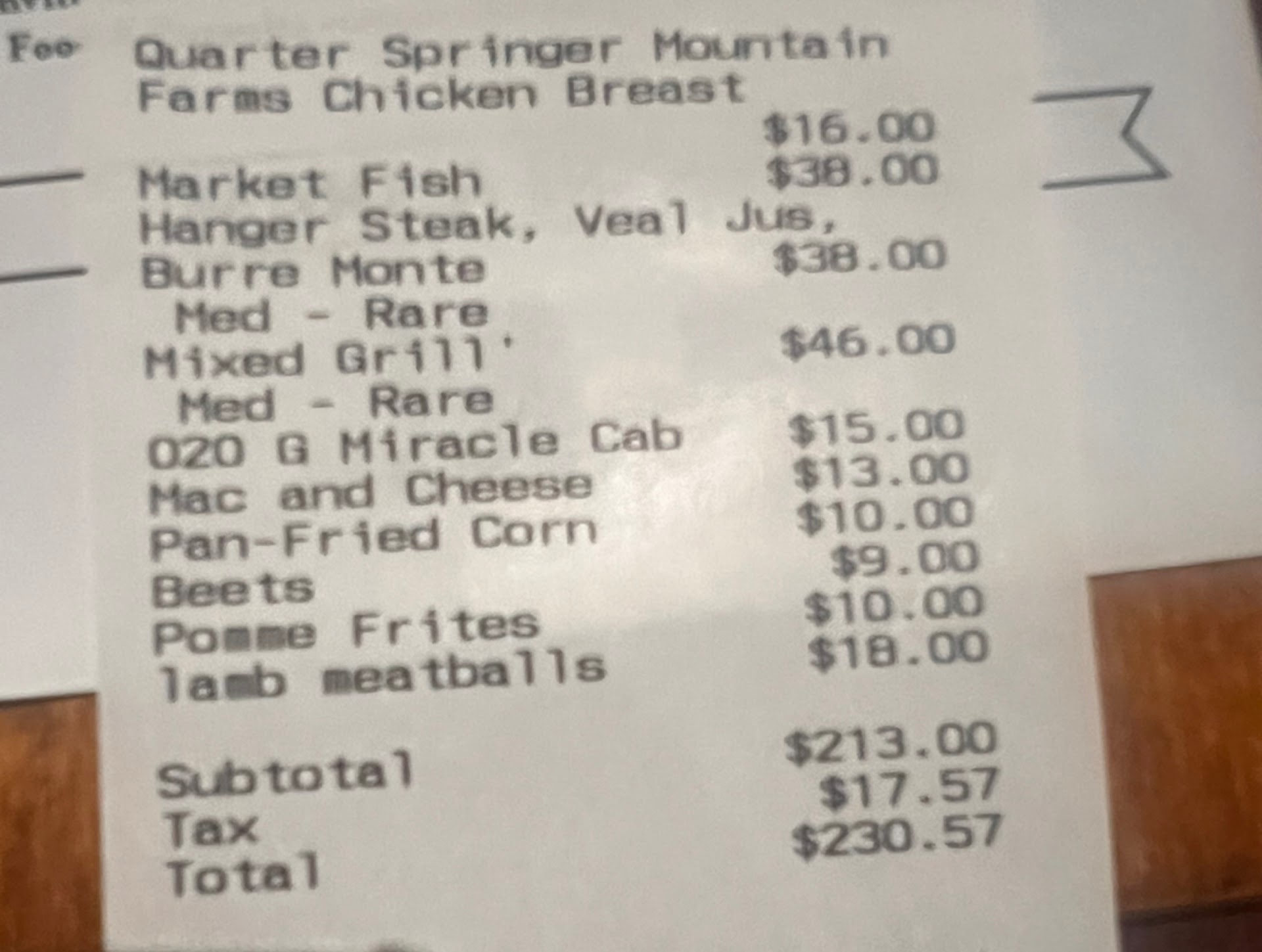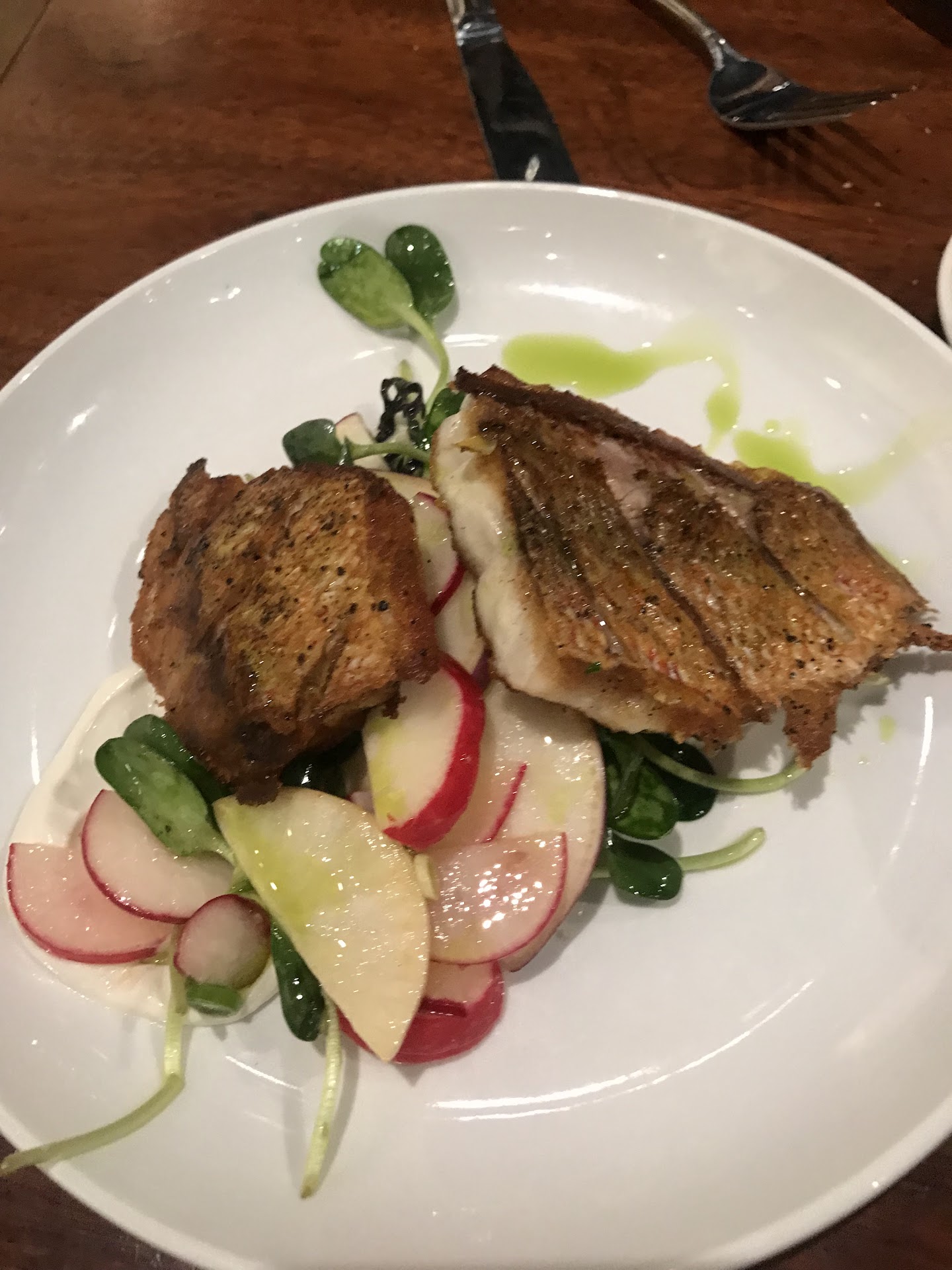 Here is what we ordered: Appetizer oysters $15 they were fried, served over cocktail sauce 6 on a plate, the taste was nothing special Snapper served over “veggies” $28 Over cooked and dry, wasn’t specified that it was fried on the menu. Veggies: a few leaves of kale, less than a half of radish and a spoon of sour cream