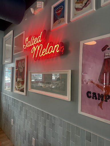 This is a cute neighborhood outpost of the Salted Melon āchainā (there are now 3 locations, I think?) itās nice because it has parking. There is inside and outside seating. You order at the counter and then get a number for your table. Whatever finish is on the tables makes it sticky, so it doesnāt necessarily feel clean, even though you JUST watched someone clean the table. The number of choices is manageable. We went for brunch, so there were a handful of choices. My strawberry fields forever iced coffee was amazing. I could probably drink those non stop. The bandito (breakfast) burrito was good. It was egg heavy, but I liked that it included tater tots. The avocado toast was pretty plain and seemed expensive for what you got. The notorious BEC was pretty standard. The plating was very basic for all- nothing fancy. The silverware was nice and heavy. The water:ice machine was kind of cool - you could pick just ice, just water, or both! The decor was cute inside and the people working there were nice. Our orders came out sporadically, even though we ordered at the same time. They did a brisk business with lots of people inside and out enjoying a meal. Overall, I would go again- itās convenient and quick,...