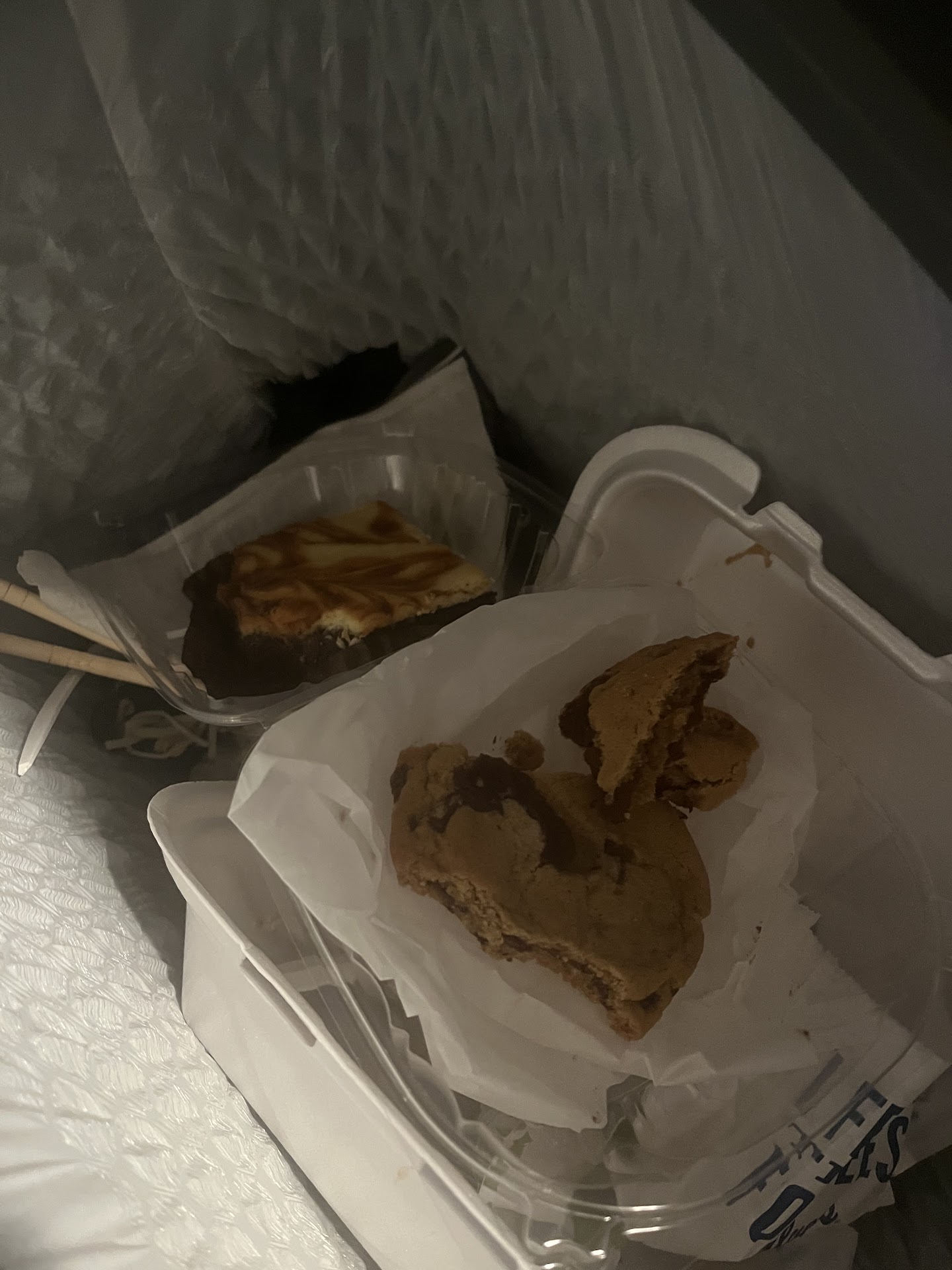 Your salted caramel brownie was so salty, I could taste the ocean. The first bite I took I just spit out. I was in disbelief. I tried another side of it, thinking maybe it was just that one area. Nope. I couldn’t eat it, it was just a bar of salt, not even the dark chocolate can atone for it’s saltiness. I’ve had this a multitude of times here, never had I ever bit into a bar of salt. Next, I tried the chocolate chip cookie. For sure no one can mess up a chocolate chip cookie? Nope. It tasted like a refrigerator. I took another bite, thinking maybe I was mistaken. No, it tasted like you left it unwrapped properly, put it in a fridge and then out to serve.
