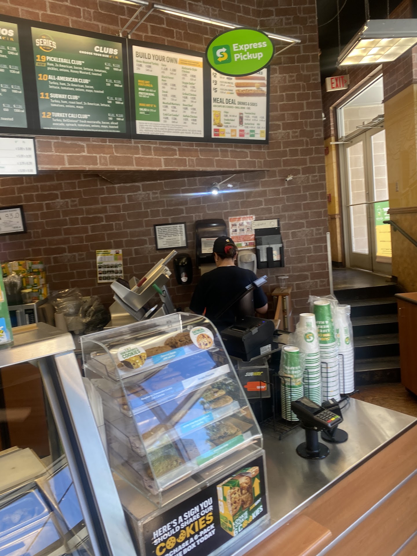 Worst subway I have ever been to. They screwed up the sauce and re-used the bread and part of the veggies that had the incorrect sauce to start with. When they replaced the over roasted chicken, they tried to not roast it until I asked for it, and even tried to toast the bread for the second time until I had to tell them to not do it since it will burn the bread. And the lady who was doing all this looked at me as if I did something wrong!