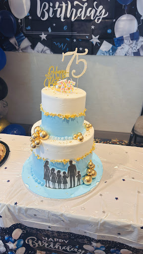 Read moreThis cake was the absolute highlight of the party. The design was elegant yet festive, with a smooth blue and white finish accented by gold details and metallic spheres. The silhouette of a family along the base added such a warm, personal touch that everyone commented on it. The cake topper with the glittering “75” looked beautiful and made the celebration feel extra special. The flavor was just as impressive—moist, fresh, and not overly sweet.