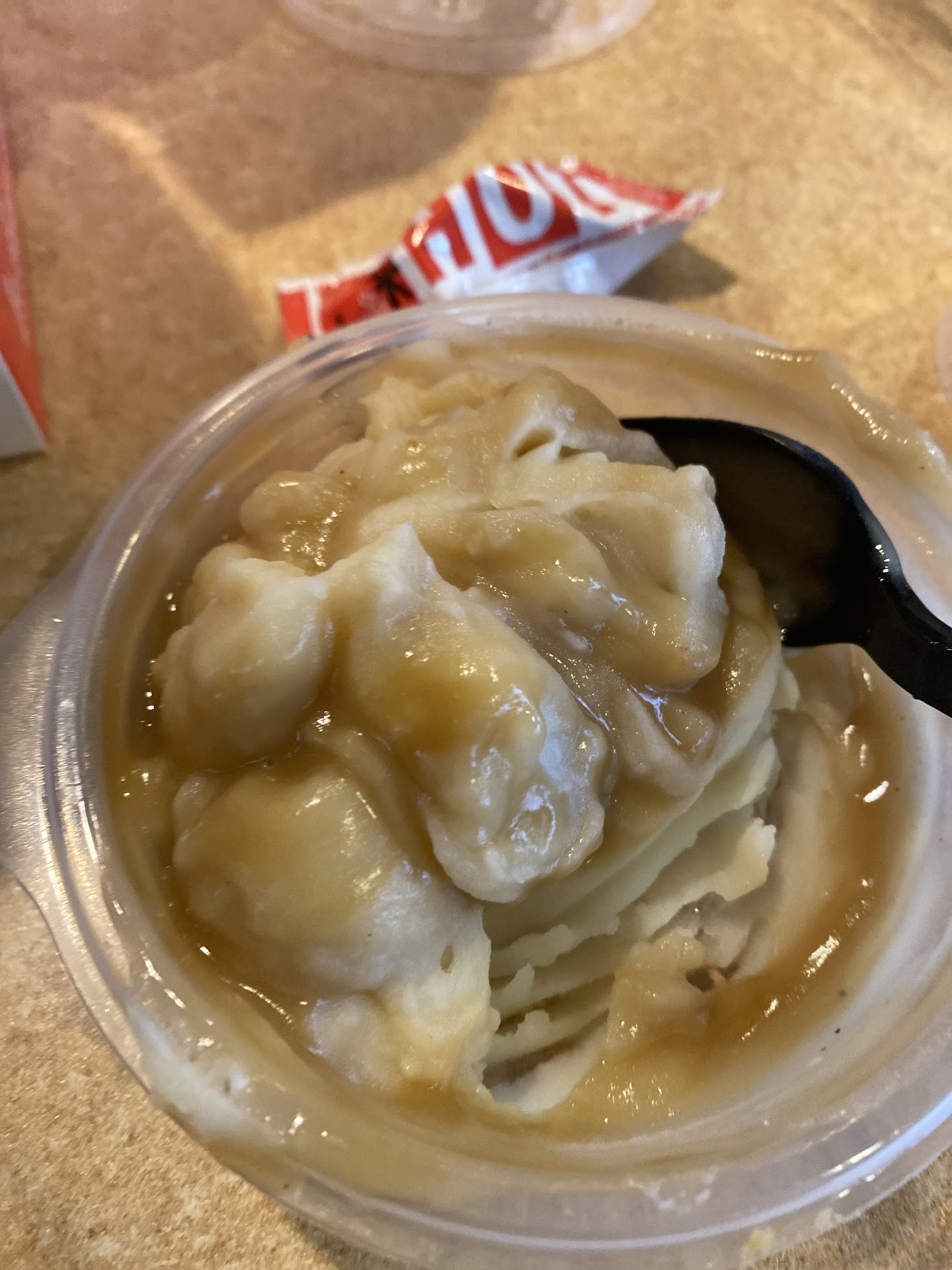 Now for the good part (sarcasm). Upon opening my food at work, I found the two plain Jane tacos. Unfortunately, one was hot and one was cold. My chicken combo consisted of two decent sized pieces of chicken that were luke and not the freshest and mashed potatoes and gravy. There was no biscuit with the meal.