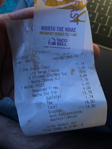 Ā Ā Ā Read moreYou ever have that ultimatum of questioning whether to bother leaving a review, or not? Well this is mine. I went to this Taco Bell with a Mobile pickup at 10:40pm. The line was average for a fast food place, and yet it took 45+ minutes to get my food. Starting with the slow line, I got to the Mobile pick up speaker and waited for 15 minutes with my window down in the rain waiting for a server to speak. Nothing. I said āhello?ā A few times, and grew frustrated, so I then just decided to go up to the window. After waiting for an eternity, I got to the window and explained I had an order. One girl sat and talked to my dog for 3 minutes completely disregarding her work, when they were clearly behind and then finally told me they were preparing it. Another 15 minutes of waiting for them to prepare it, they finally give me my bag and I drive off. I then get home at almost midnight, look in the bag, and itās another persons order. Not even half of what I ordered. I wanted to drive right back to complain, but I would have been waiting an additional hour, probably even till after they close. Called multiple times with no response. Iām beyond aggravated I spent nearly $20.00, and yet got one meal that wasnāt mine, and wasnāt even warm at that point. Will never be...