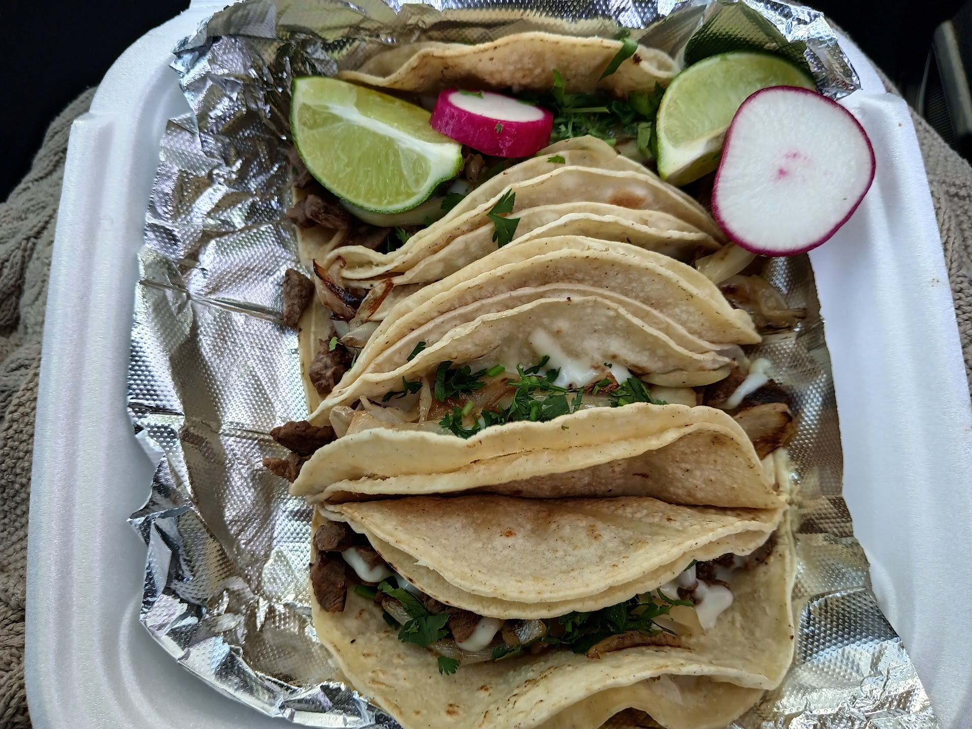 My appetite was ambitious: three tacos - chicken, steak, and seasoned pork, and for a twist, some fried plantains with sour cream and cheese. The tacos, nestled in double corn tortillas, were adorned with cilantro, tomatillo salsa, onions, radish, lime, and a brave whole jalapeño. As a self-proclaimed gringo, Iâm a flour tortilla fan, but for the sake of authenticity, I dove into the corn tortillas, finding them delightfully fresh and warm.