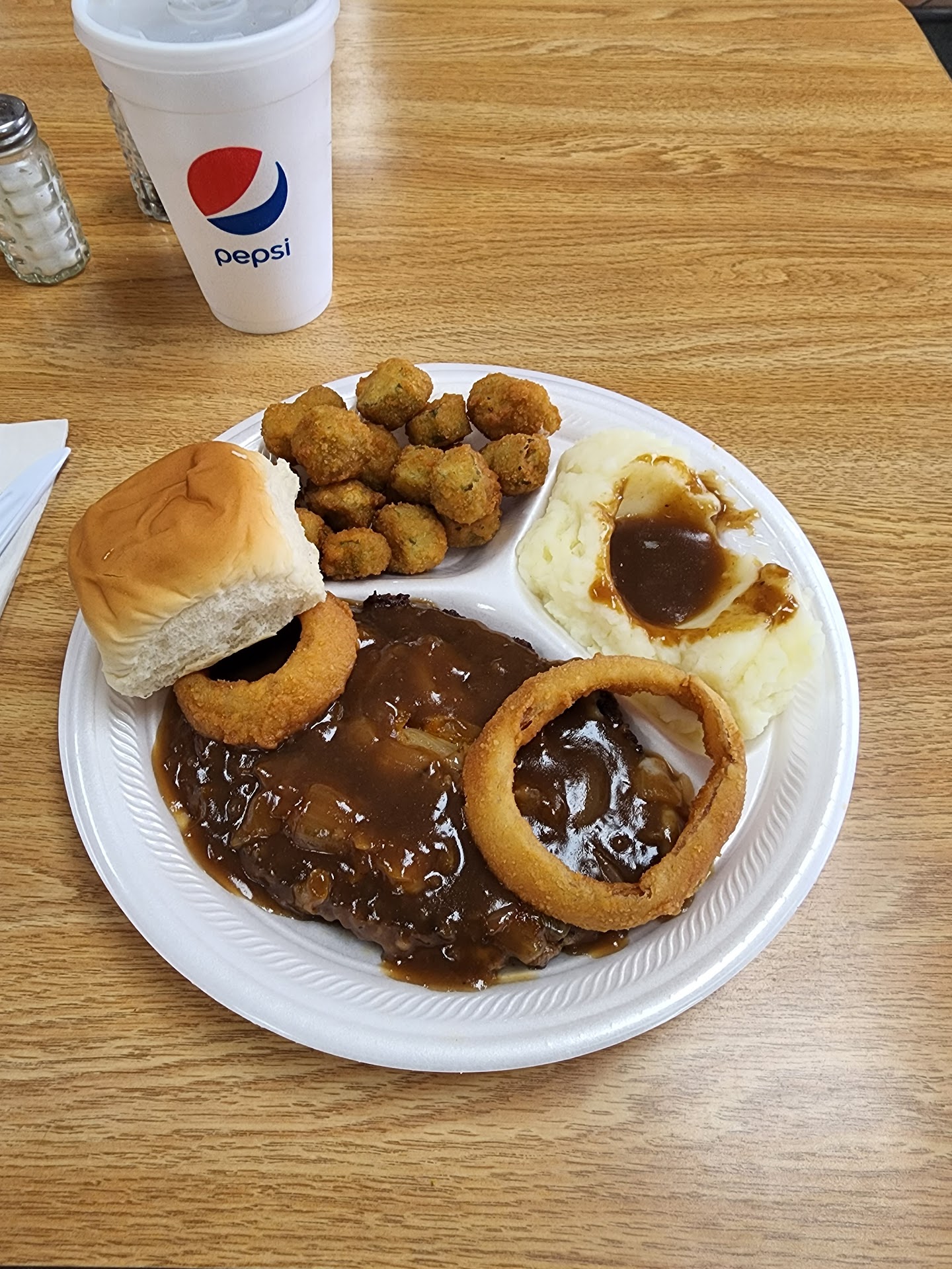 I've had the hamburger steak twice w/ gravy and onions, and a double cheese burger with the works (it was one of the mid-week specials). Burger was definitely solid but I wouldn't go as far as some of the other reviews saying best in the city. That hamburger steak w/gravy is awesome - awesome enough that it'll be tough not to make that my regular order when I go there, instead of exploring the menu more! Typical regular and southern sides available (fried Okra, Mac, crinkle fries, onion rings, mash and gravy, etc.) A lot of sides available, so you'll find a combo that fits your taste. Also, for the amount of food you get, price is great!