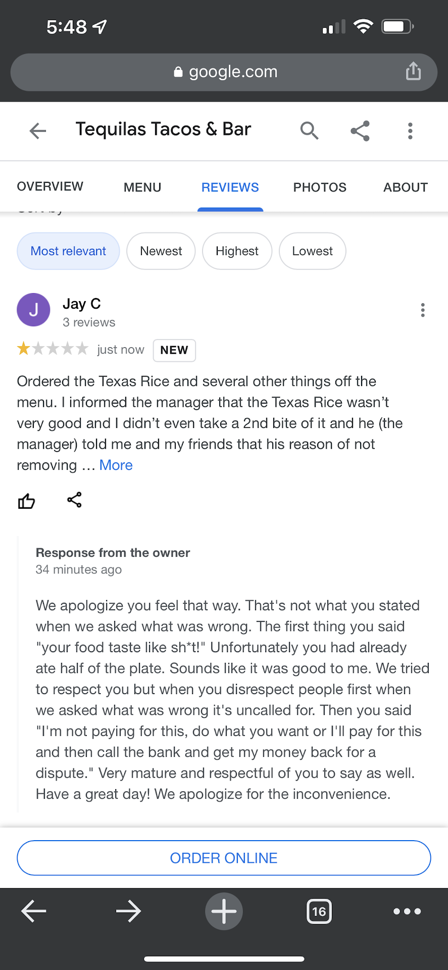 Ordered the Texas Rice and several other things off the menu. I informed the manager that the Texas Rice wasn’t very good and I didn’t even take a 2nd bite of it and he (the manager) told me and my friends that his reason of not removing the charge is because “I know my food is good so I’m not removing the charge”. I told him that wasn’t very good customer service; especially that I hadn’t even eaten any of it and he threatened to call law enforcement on me and my friends. Management was very disrespectful, everything else was pretty good besides the Texas Rice; however, I wouldn’t recommend going there as the management is very rude. Another point, the service was horrible. We waited 15 minutes before being acknowledged and sat down, We were sat at the back of the restaurant and our server came over 2x in the entire 2 hours of being at the restaurant. She got our orders wrong and other servers had to come and apologize on her behalf and fulfill our orders. Overall the entire experience was horrible. I’ve never felt so disrespected before and this was my first time going and I won’t be going again. [EDIT:] Please review the screenshot of the response from the owner. In response to the owner who responded: Thank you for your response, it seems very customer friendly with the way your response was stated. I never once stated your food tasted like “Sh*t” I simply explained to you that I had gotten sick off your Texas Rice entree and you stated “I know you didn’t get sick off the food, I know my food is good” and proceeded to let me know about the sign at the front that stated “no refunds” and it escalated on your behalf from there. Also, I hadn’t eaten more than 1 bite off that plate. I definitely appreciate your response and I hope all of the others see what type of establishment you run and how disrespectful you are to your customers.