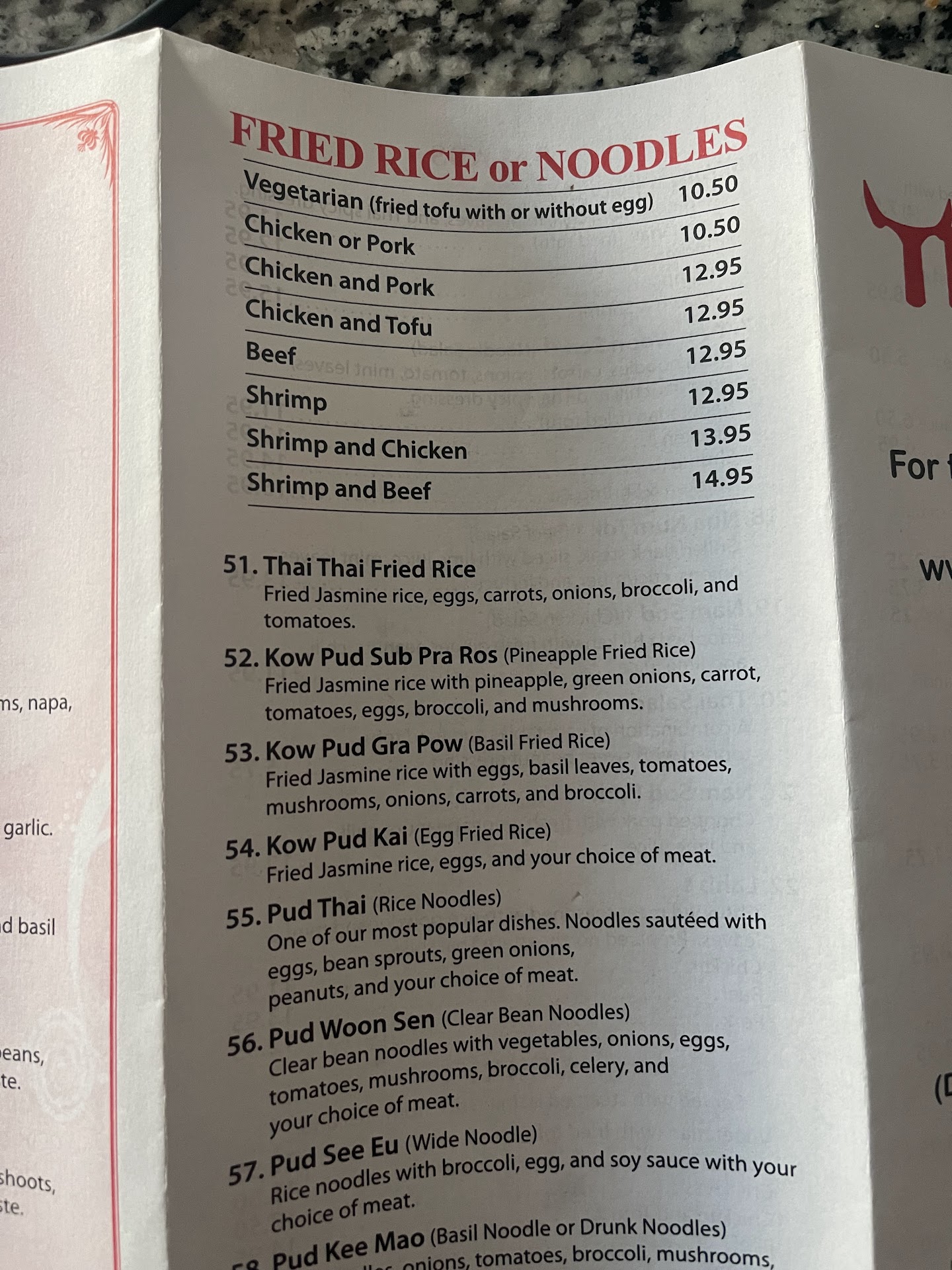 Read moreI’m really disappointed in the decline behind this restaurant. They just changed management and started gouging on their prices. Thai Thai was always my go to hole in the wall spot for cheap Thai food that wasn’t necessarily the best quality, but it was inexpensive and got the job done, so I loved it. They recently changed management and increased their prices while also making their portions smaller. Just another example of shrinkflation in 2025. I posted a picture of their menu from just a month ago vs. the menu today. Everything is more expensive. Also they used to pile up your food into a massive styrofoam box that was literally overflowing with food. Now, they have downsized to smaller Chinese takeout plastic containers. With these higher prices and small portions I might as well go to a nicer sit down Thai restaurant that’s basically the same price and double the portions. Really sad to see charlotte lose its last inexpensive...