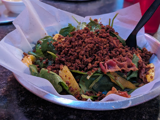 All that being said, let's get to second: the praise about the food! Holy moly is this place tasty. Our 12 year-old is a very slow eater. But their rice & bean tacos were so tasty that they finished eating before my food arrived. We have never seen that before. Technically our kid ordered a guacamole taco, but there was no guacamole on it. We didn't get charged extra, so no harm, no foul. I ordered a spinach salad and I chose the soy crumbles as the protein. The salad was wonderful! Spinach was fresh. Orange slices were peeled perfectly with no pith or bitterness. The bacon pieces were a great surprise, as they were unexpected by me and also cooked ideally (not too crispy). The avocado ranch dressing I got on the side was really tasty and wonderful for dipping crumbles into. I cannot say enough good things about this salad! My wife loved her meal as well, although I can't remember what she got because I was so focused on my delicious plate in front of me. I know she had something with refried beans while our kid's tacos came with black beans. Both of them were happy with their bean choices.