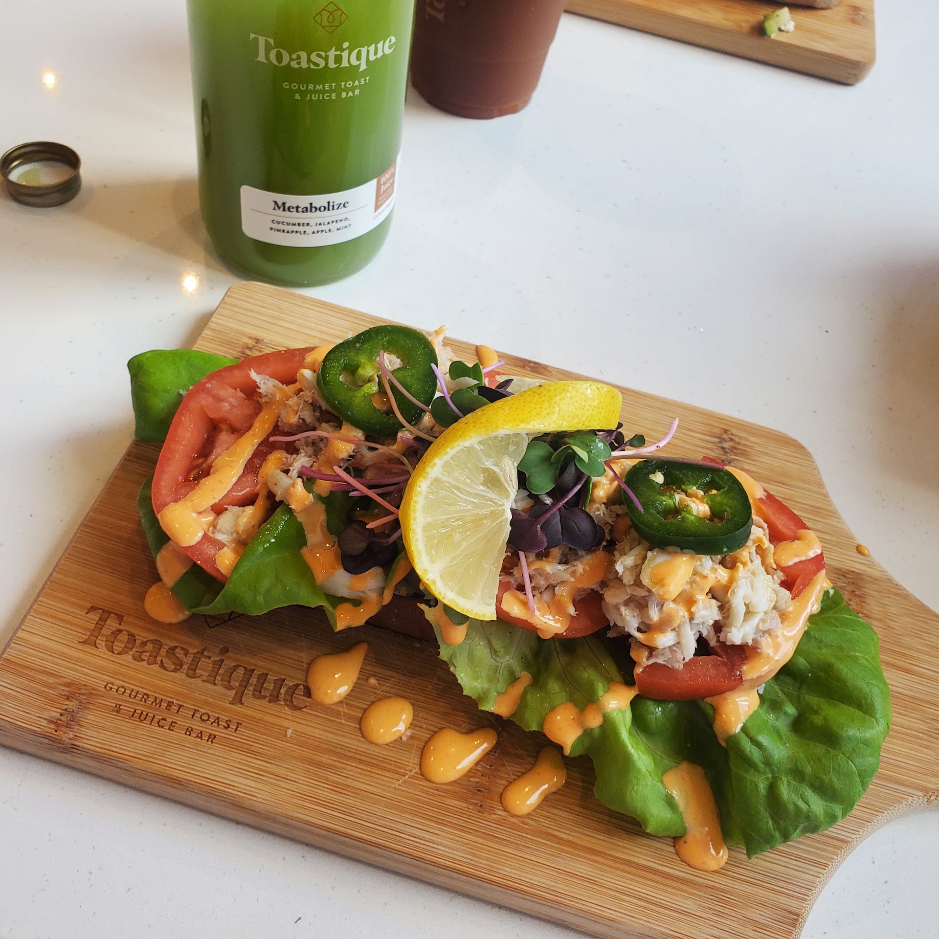 Food: 5/10 Flavor wise itās good. Flavorful, fresh, not revolutionary, but itās tasty. Iām full without feeling stuffed or bloated. Playing. And presentation is also very gorgeous. Hereās my main issue. The toast looks beautiful but is almost impossible to actually eat. Items are cut way too large. The bread is a good thickness but not toasty enough to handle the toppings without turning to mush. If Iām paying $15 for toast I want a crispy bread and all of my toppings in every bite. We tried 2 different toasts and they were tasty but ridiculously messy even with a fork and knife.