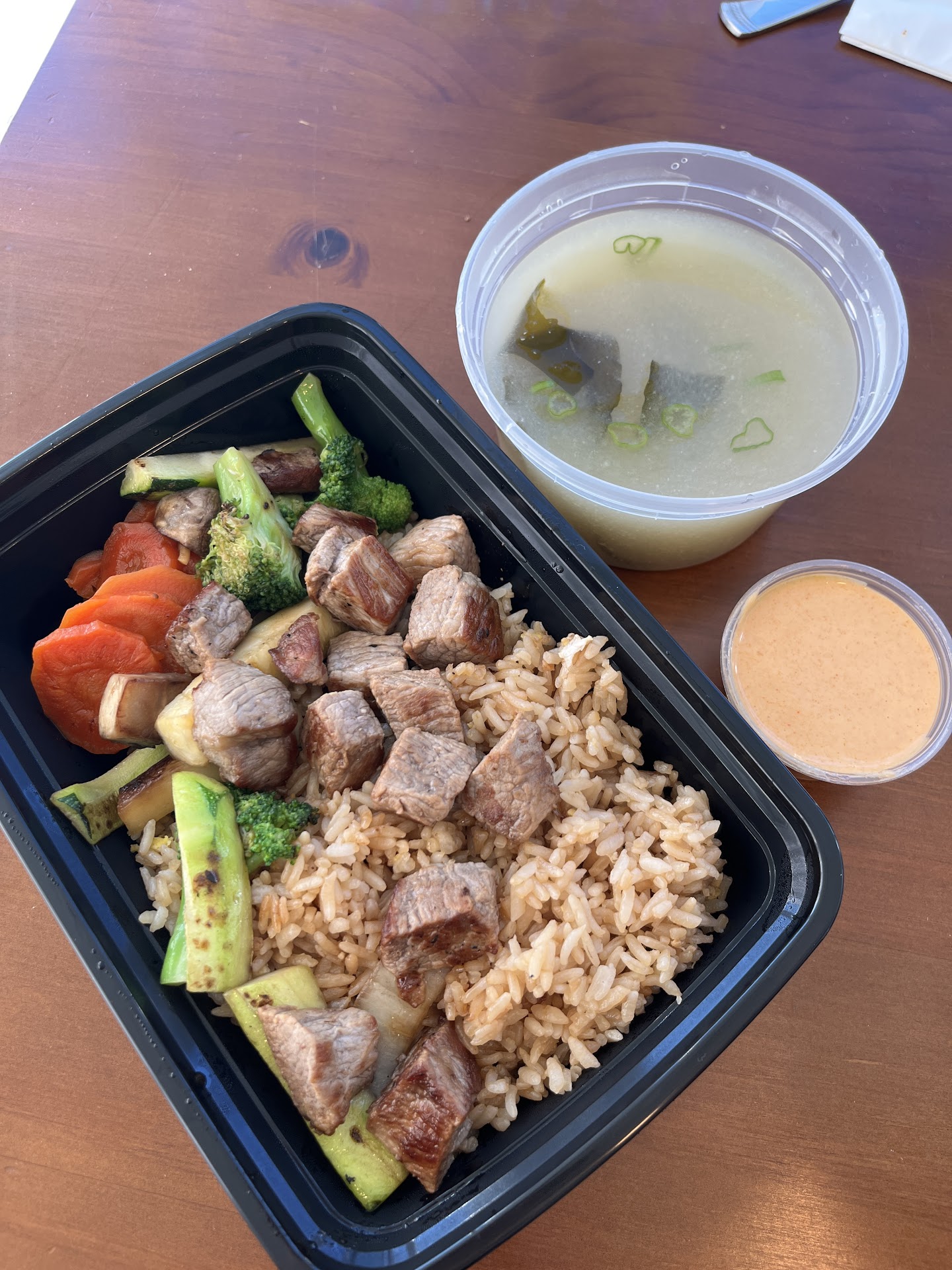 Read moreThis is quality hibachi express for a good price. The food has a clean grilled flavor that you would expect from a sit down hibachi restaurant. The YumYum sauce had the flavor that makes great hibachi. I got the hibachi steak with fried rice and a side of miso soup. It came with sweet carrots that were the perfect level of sweetness and the vegetables came with zucchini, broccoli AND mushrooms. Typically other hibachi express places only allow you to choose 1 type of vegetables with the standard meal and if you want more they charge you. My husband got the garlic noodles and they were also delicious. One thing to note is that they only have 2 sides of bar seating so not too much availability for inside dining but it’s hibachi express so not that big of a deal. I will definitely be coming back :) consider...