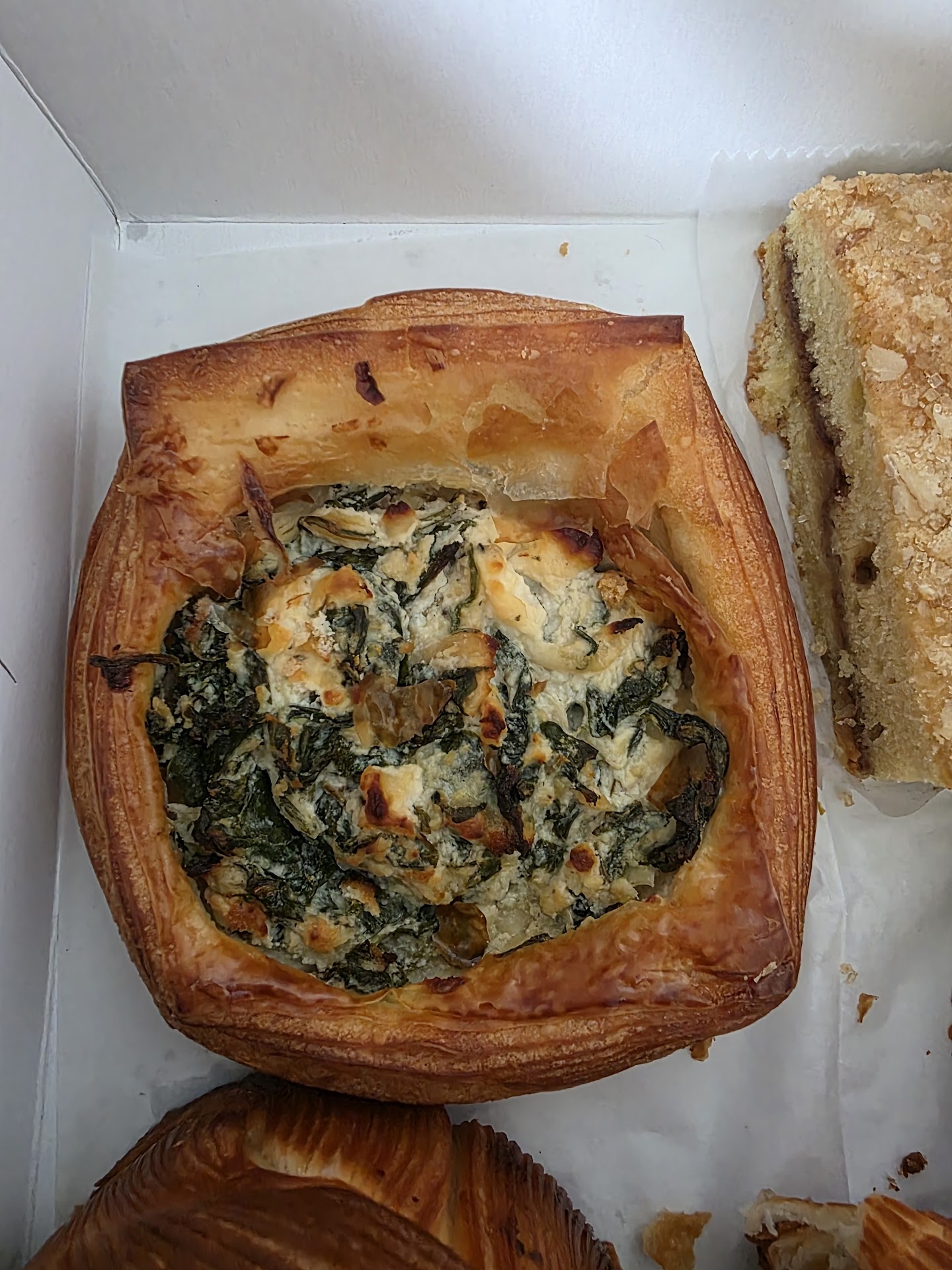 After reading many reviews, we tried this place today, and the others weren't lying. These pastries are absolutely fresh, flaky and delicious!!! We arrived just before 8am and bought several items to try. My favorites are the spinach feta, chocolate croissant, and crownie (croissant on the outside with a chocolate swirl top, and a brownie chunk with dulce de leche on the inside). I'm not necessarily a fan of the coffeecake because it's not my preference. The spinach bacon quiche, although a little salty and smokey flavored, is delicious as well; however, I'd prefer a little less salt.