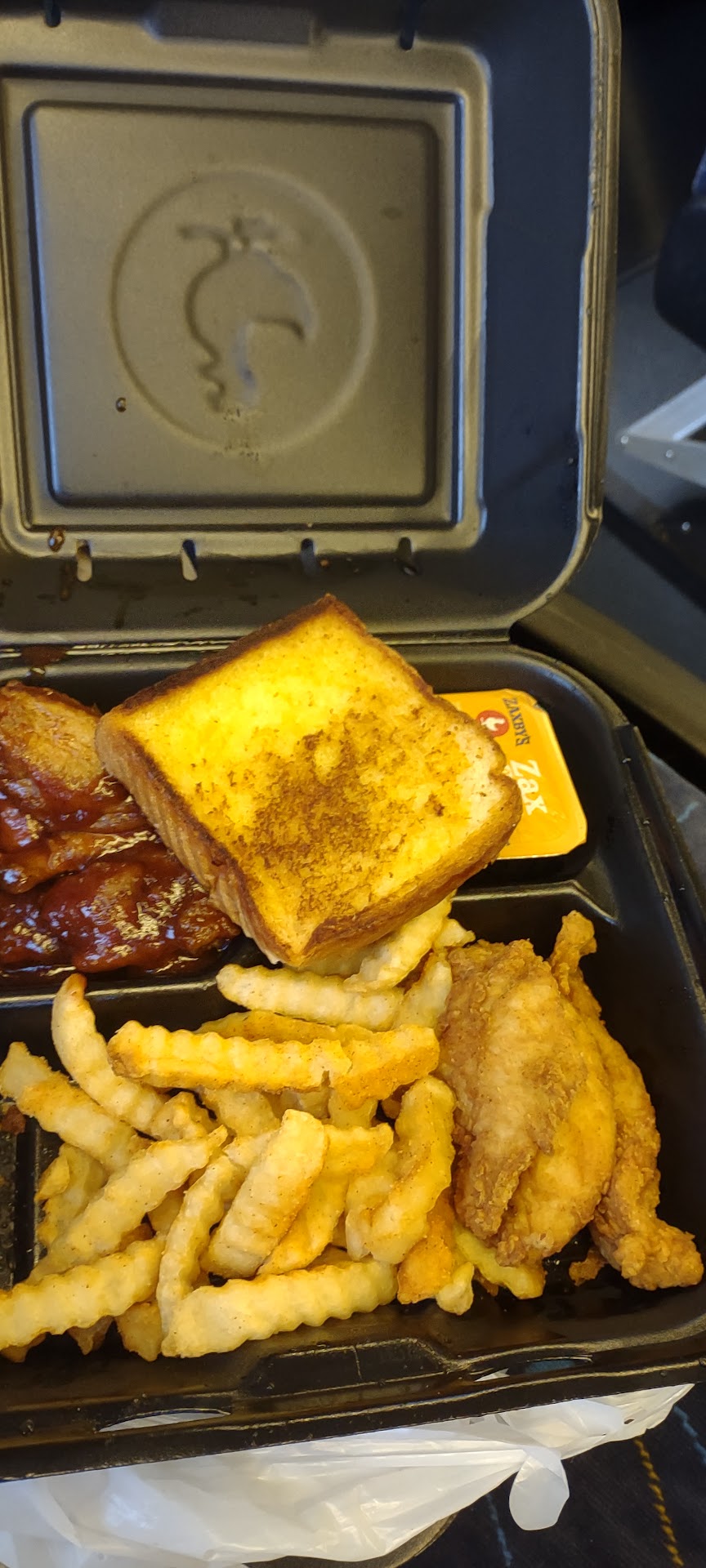 Since Zaxby's had previously been one of my favorite places to eat I thought at least the food would be recognizable. The boneless wings were tough and the hot honey mustard sauce was mixed with what I assumed was barbecue. It was so terrible I only ate two wings and decided to eat a sandwich when I got home.