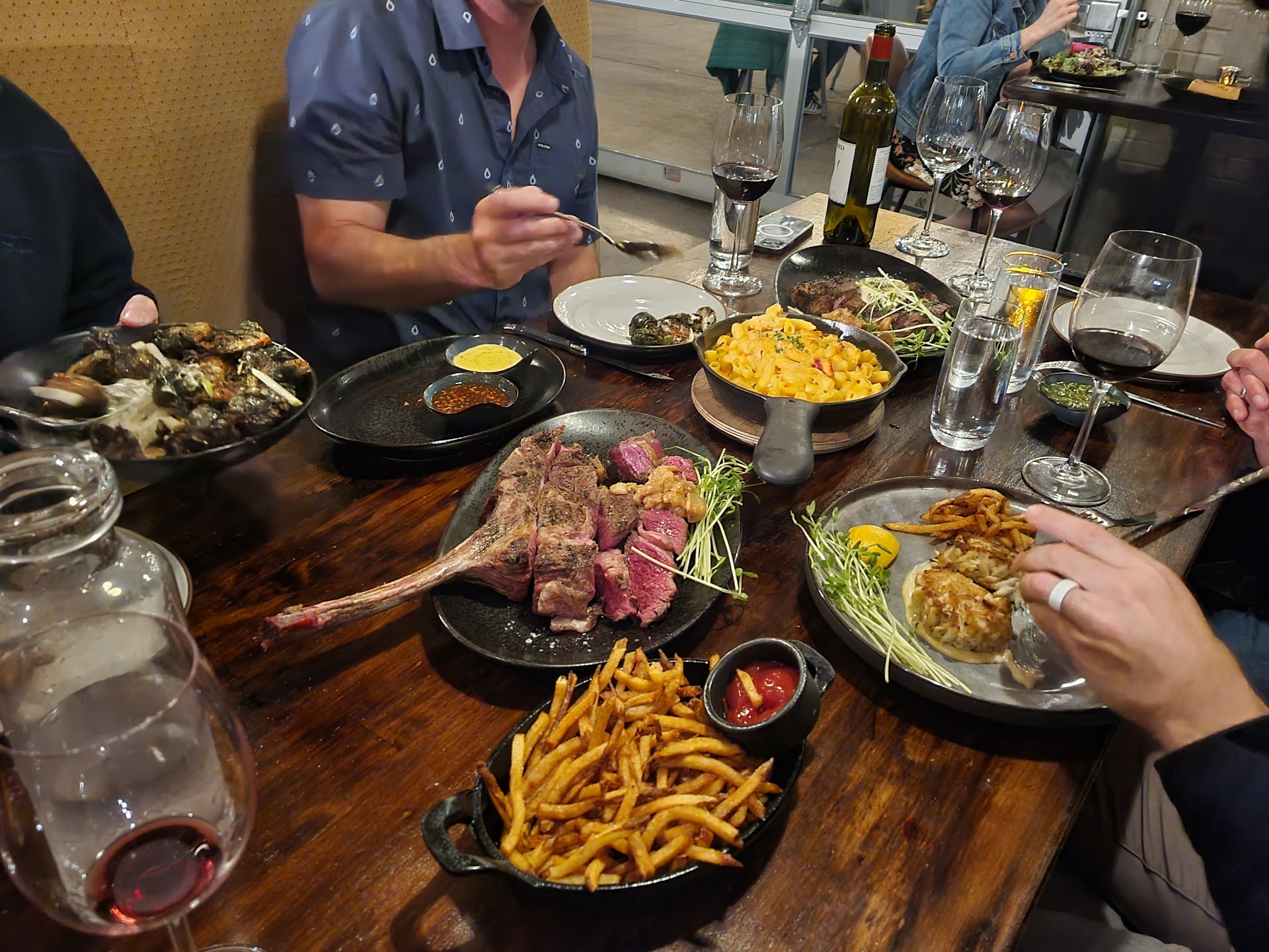 The bad: We ordered the large Tomahawk steak medium rare. One hour after ordering it we heard the kitchen give out a tomahawk shout/chant and got ready as we assumed our food was coming out. Our waitress informed us they had just put it on the grill. 30+ minutes later it arrived. Our waitress informed us they had it in the sous vide prior to the finish, which is why it came out so fast (face palm). The meat was still quite raw, which we are okay with normally, but it wasn't medium rare and we couldn't chew through it. Best guess is the sous vide was set far too low and none of the fat rendered. Criminally, there was no crust/sear. We had an undercooked, tough piece of flaccid meat.