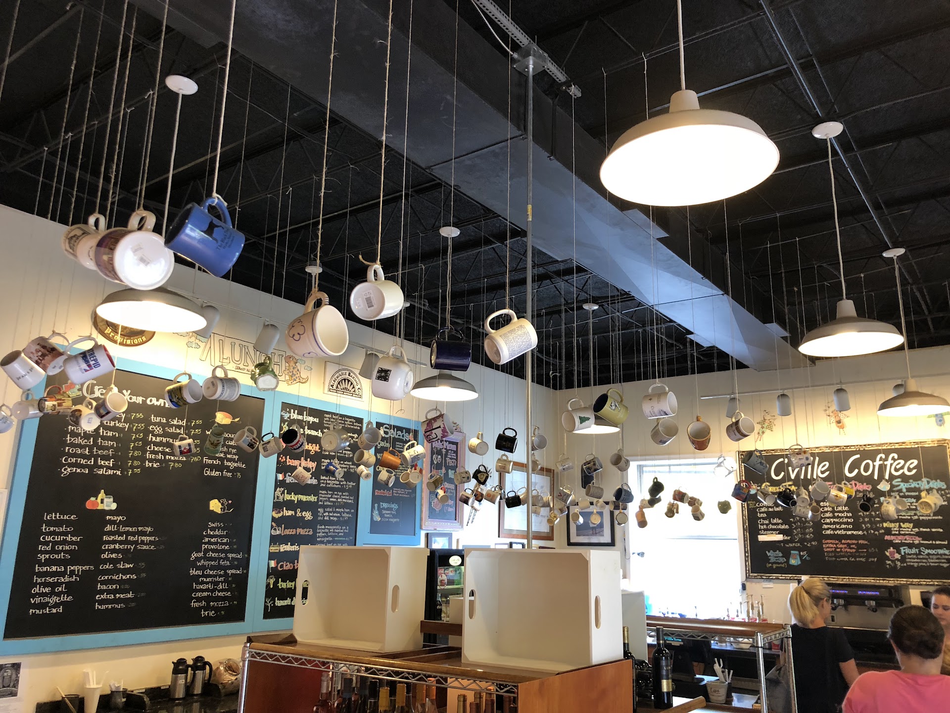 Mugs dangle from the ceiling at this cafe with espresso drinks, breakfast & lunch sandwiches & wine.
