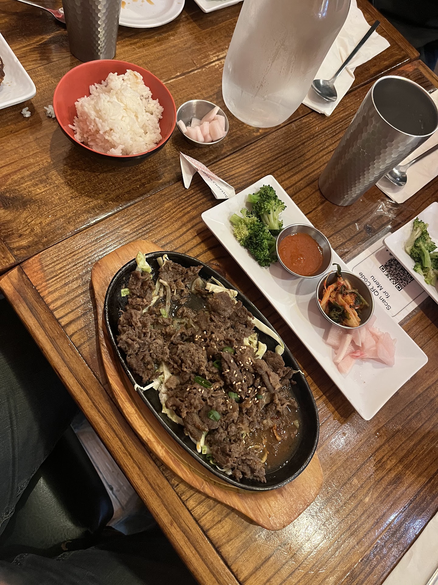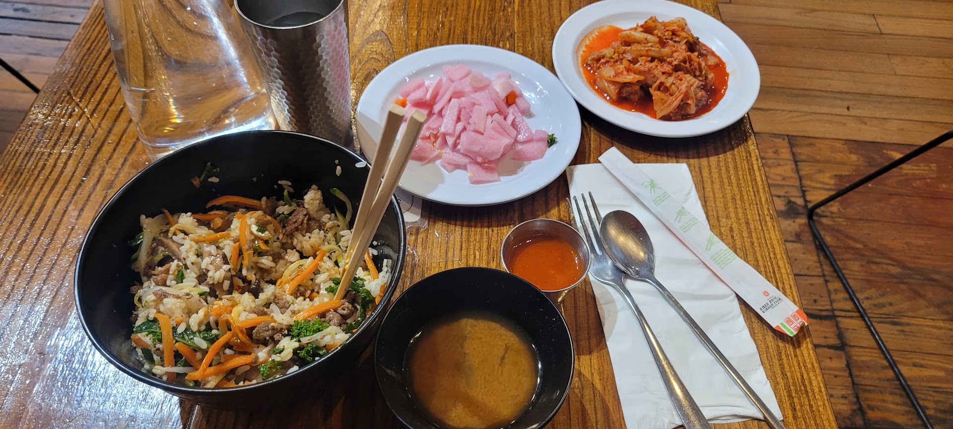 I highly suggest getting the bibimbap in the hot stone bowl to keep your food warm. We ate as a group of 6 and some people mentioned their food was no longer hot, but mine was steaming hot even halfway into my meal. The beef was very flavorful and delicious. I noticed there was not a lot of rice in the bowl, which is fine with me as I enjoyed the fried egg, beef, and plentiful toppings (sautéed onions, carrots, sprouts, zucchini, and greens). If you love rice you may have to order some extra rice. The bowl was filling though!