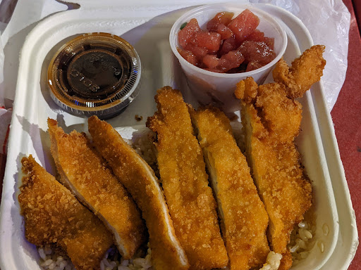 Read moreMy husband and I went in around 730pm(they close at 8pm) and the shop was empty. We looked at the menu and started to order some food. The mochiko chicken was great! The mac salad was also good and the cucumber kimchi was actually really good! You should try it out! They give you two shrimp tempura for the side and each tempura is a whole shrimp. Not too bready and you can taste the meat! The chicken Katsu was average though! I had high hopes for it. They also didn't have enough fried rice for two orders hence one of us got brown rice as a substitute.