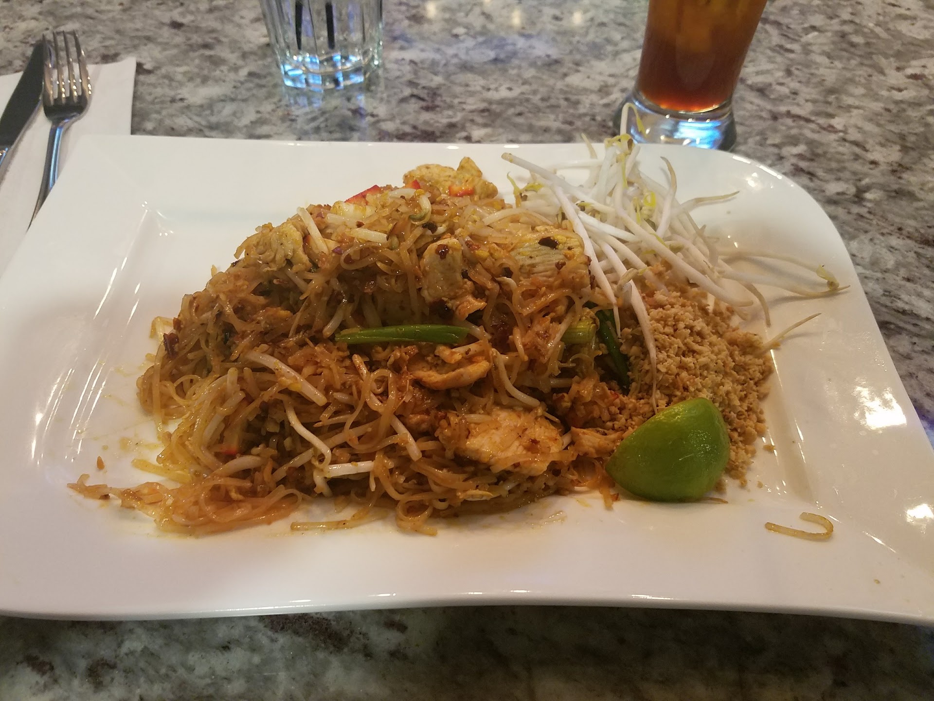 The atmosphere is nice. I went in after a doctor's appointment, before a long drive home. The food is not bad, but not stellar, either. The service was severely lacking-- I am pretty sure my 1st server left and it seemed like he didn't tell anyone he had a table, because I wasn't checked on after my food's arrival and sat about 30 minutes after I was done waiting for a check, which was brought to me by someone else. I had pad thai in the restaurant, and a piece of char siu pork made its way into my vegetable dish, which isn't great as cross-contamination goes. I can't process alpha-gal, so if I'd eaten that pork, my guts would have been wrecked. Now I'm going into personal nitpicks that probably don't apply to most diners. The pad thai sauce was off to my taste. Maybe it had sat open a while, or was burned? I've had other restaurants serve me a more barbecue or "smoky" pad thai, though, so it could just be their recipe. There was no detectable fish sauce, either. It wasn't bad, it's just not what I crave when I crave pad thai. I brought home drunken noodles; they offer spice 1-3 on menu, but you can request "5 star" spice. I feel the noodles are a bit overcooked and mushy, but this could be due to sitting in a Styrofoam box. The level 5 spice is adequate, but nothing that will make a real spice-chaser's lips tingle. What disappointed me was, like many cheaper places, their heat comes directly from chili seeds in the food. I find this a less pleasant eating experience; I am much more impressed with a homemade chili oil for heat. A few seeds are expected, but when it's hard to chew your food through the seeds, it's a little much. But, at least they gave me spicy...I'm a middle-aged white lady, so I did get double-checked by the server that I sincerely wanted extra-spicy. 🤣 I have been quite a few places where I asked for extra spice and got a very mild "that white lady" dish. All in all, it was a good experience, and I would go again, but I'll be choosy...