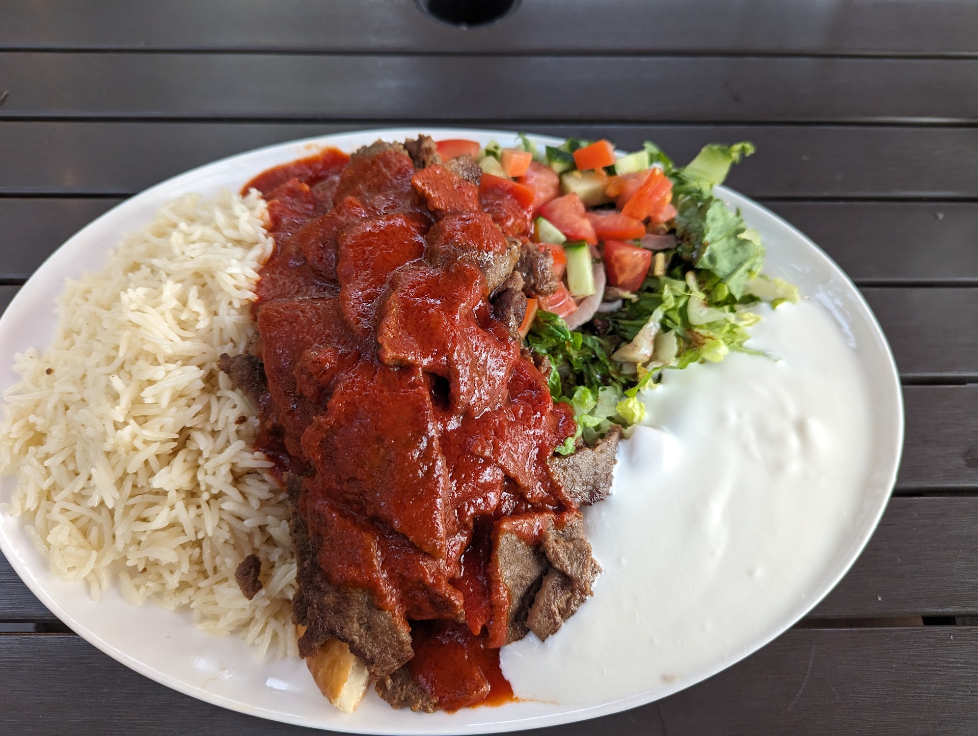 My friend ordered the Doner kebab sandwich which came thinly sliced, and topped with lettuce, tomato, onion, and a side of yogurt sauce! The meat had a great lamb and beef flavor and was seasoned perfectly! His sandwich came with a white bean salad served chilled and a tabbouleh salad. Both were very nicely prepared, flavored, and portioned.
