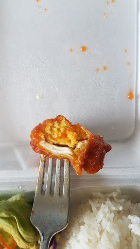 The pad Thai: It didn't have much chicken in it, and what chicken there was tasted a bit bland. I also found a single bean sprout and one tiny piece of green onion, so it seems they either forgot to actually add that into my meal, or they just have teeny tiny portion sizes for those /s. On top of that, the noodles seemed overcooked. Too sticky and too soft, so they would mostly break off in clumps. The noodle flavor wasn't bad, but it also didn't look coated in egg at all. It looked like they scrambled an egg and tossed a spoonful of it into the container. When I'd had enough noodle, I moved onto the orange chicken!