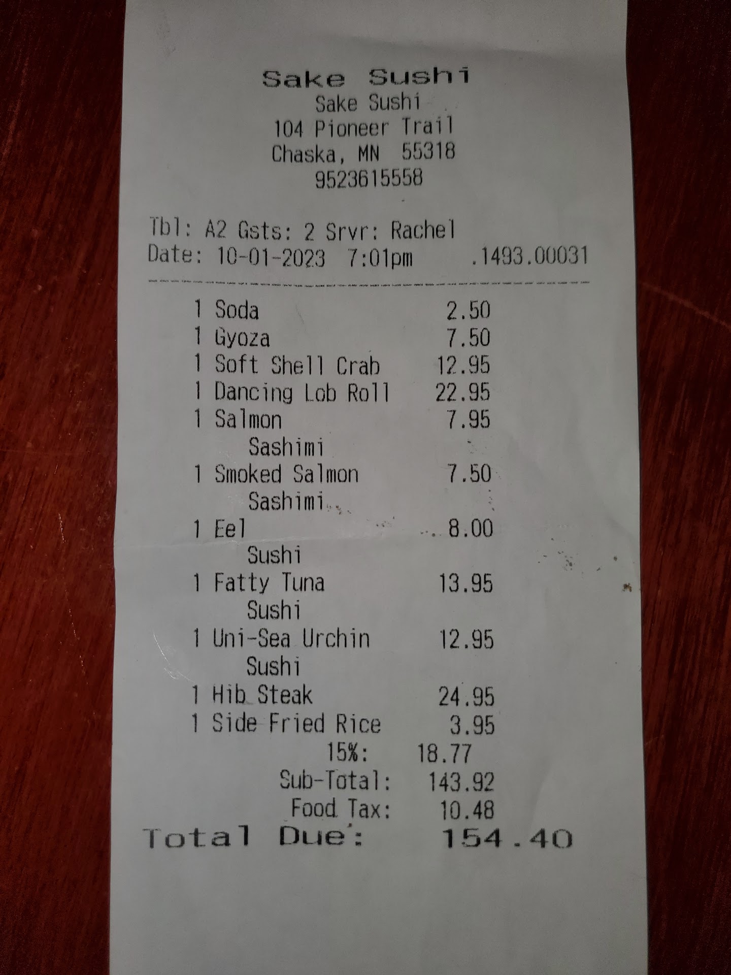 But because of tonight's experience, I will no longer reccomend them unless their are some changes. Tonight I noticed on my receipt that there was an automatic gratatuity of 15%. I didn't remember seeing a note on the menu about this. If I somehow missed a note or sign somewhere, then that's my fault. I have no problem with paying an automatic gratatuity due to my failure to notice it.