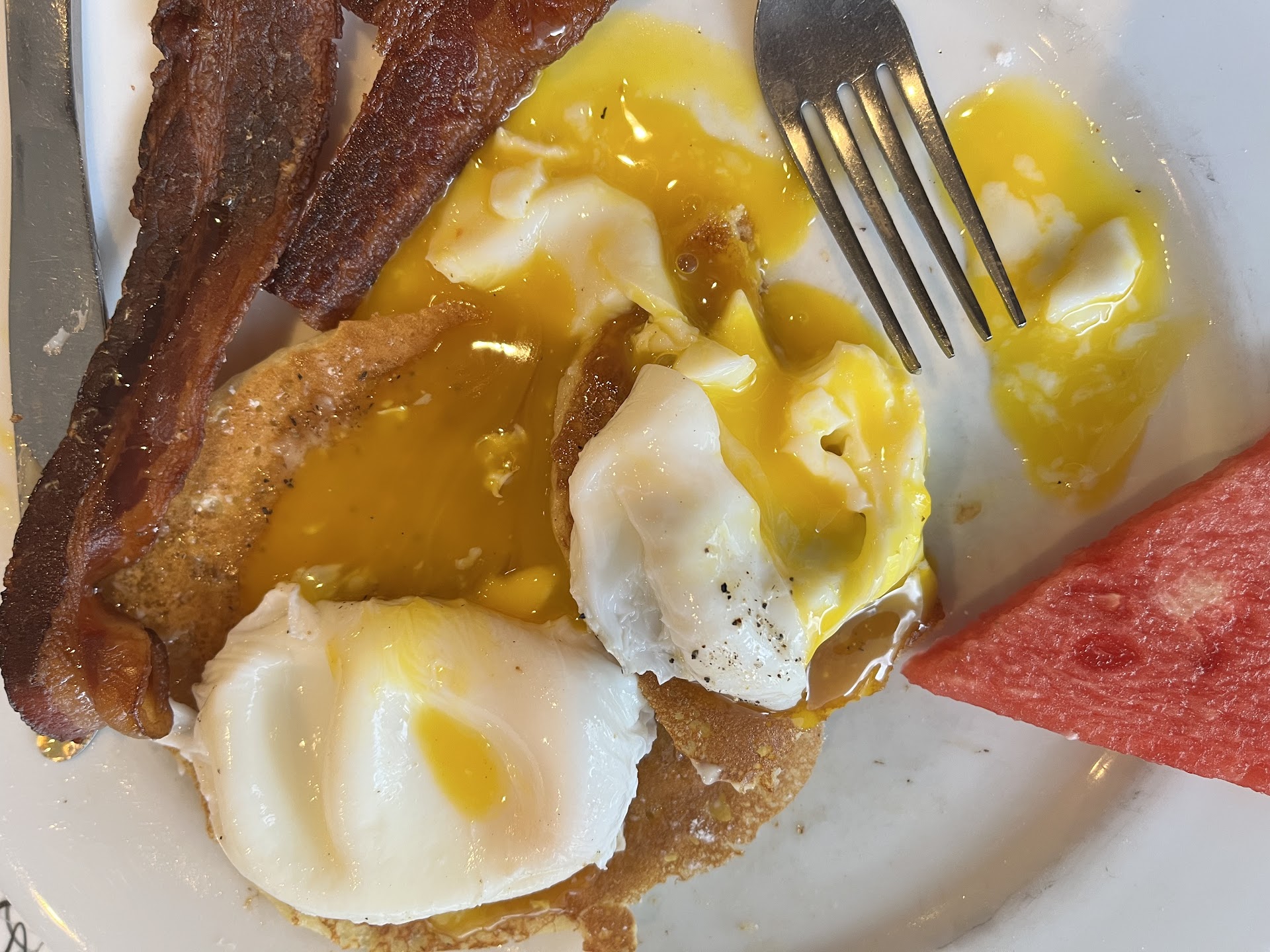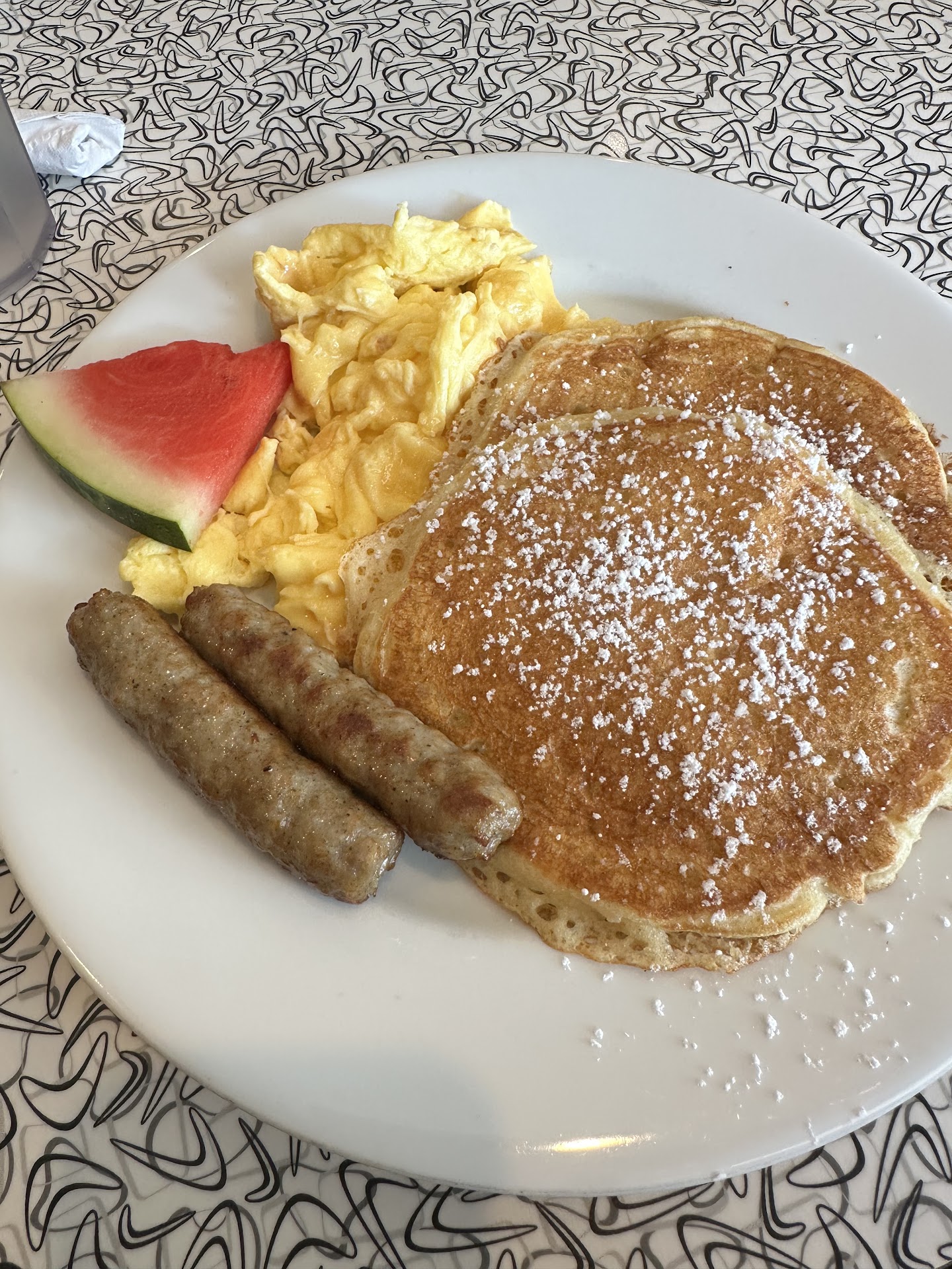 Ā Ā Ā Read moreThis was a nice breakfast spot in Chatham area. The decor was cute and some may say vintage. The waitstaff were slow to start, we waited about 10 minutes before being greeted by our waitress. Keep in mind there were about 4 workers standing at the cash register. We almost got up and left. Just then our lovely waitress who seemed to be taking orders and waiting on the entire place came. I wish we got her name because she was lovely! We got water and placed our orders asap. Once orders were placed our food came out very quickly. The pancakes were really good and fluffy. The hashbrowns had good flavor as well. The added watermelon in the side of our dishes were cute touch. Just be aware, if you pay with credit card, they charge a 4% fee. We...