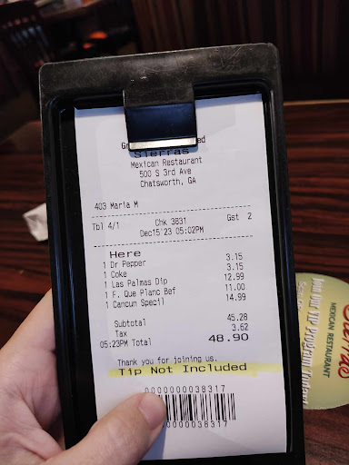 Read moreMy family ate there tonight and I have to say it was the worst experience ever!! Everything started out okay. They brought over a small bowl of chips with 4 bowls of salsa for each of us. We had to ask for extra chips however because there was not enough for each of us. When ordering our server did not write down anything we said and thus our order was completely wrong! Our server was short and almost seemed annoyed to be waiting on us. Nonetheless we moved past it... until our food came. Like I said it was all wrong. We had to send one order back and made do with the rest. We ordered 2 fajita steak dinners. We had to flag down our waitress after about 10 minutes to ask for cheese as we received none, and sour cream. We then were asked if we wanted extra or a side of each? What? What's the difference? By then the waitress was completely rude and said, "I'm just gonna send the manager over!!" The manager was extremely more helpful in letting us know we could substitute anything we wanted for something else. Our server didn't bother to let us know this even we made it very clear there were things we didn't not wish to have with our meals. Anyway... all in all the food wasn't terrible once we finally received that which we requested but it wasn't great my any means. Not for the price! As I said our server wasn't friendly at all though others were as we walked in and out. Hopefully if you go there your experience will be much better than ours. Perhaps our server was simply having a bad...