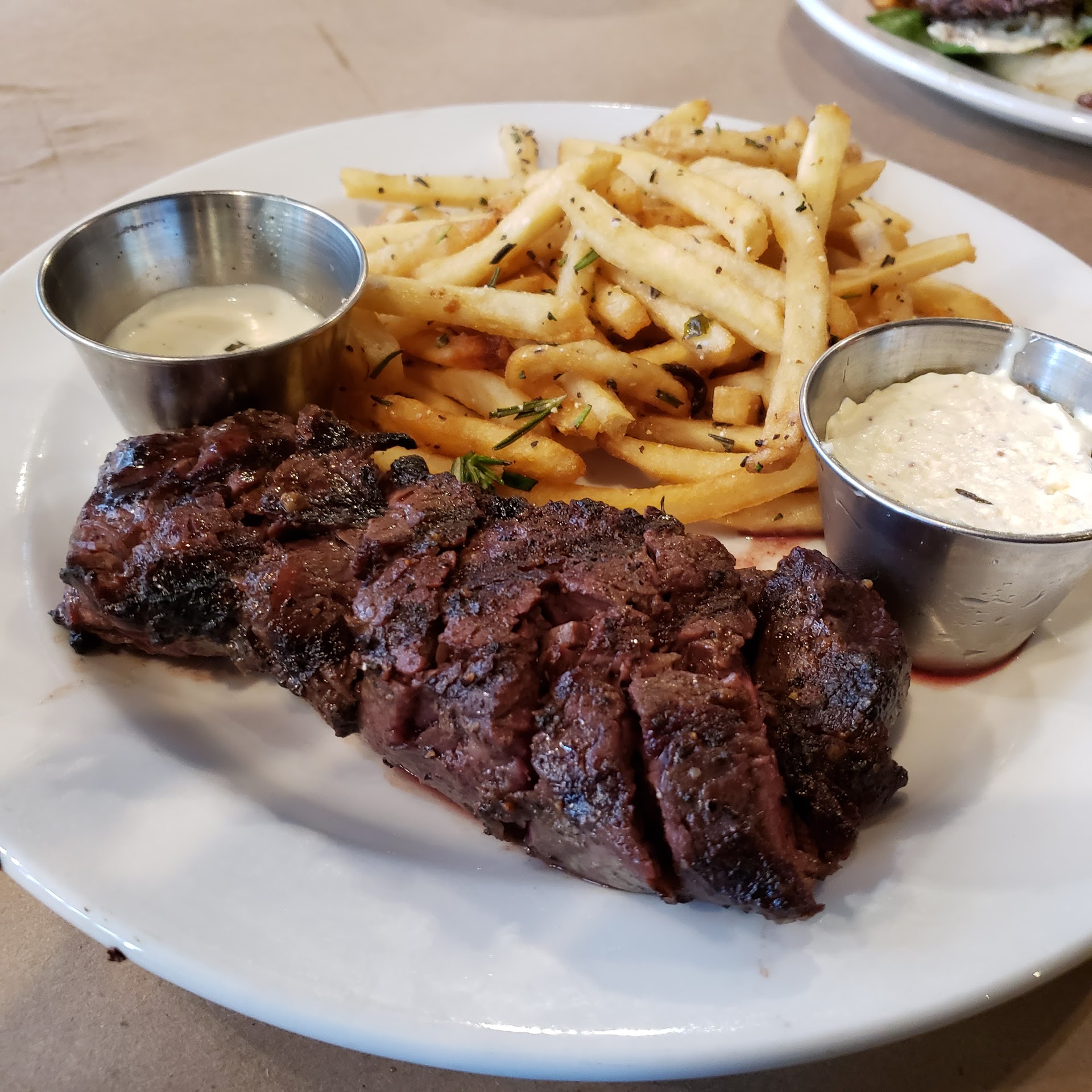 Ribeye: medium with rosemary Pom frites, aïoli, and Caesar side salad. Ribeye is cooked fairly well cook lean on the rare side. Frites with aïoli dope, Amsterdam needs to call and get their recipe!