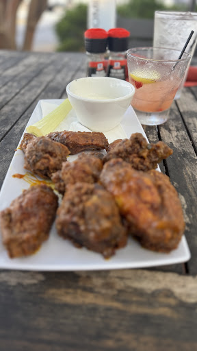 Award-winning wings: double fried and tossed in Carolina gold barbecue sauce, service, celery, and ranch for me. Blue cheese available. 10 to 10 would recommend. Savory honey, mustard barbecue sauce with a hint of tanginess crispy perfectly cooked not served overly hot.