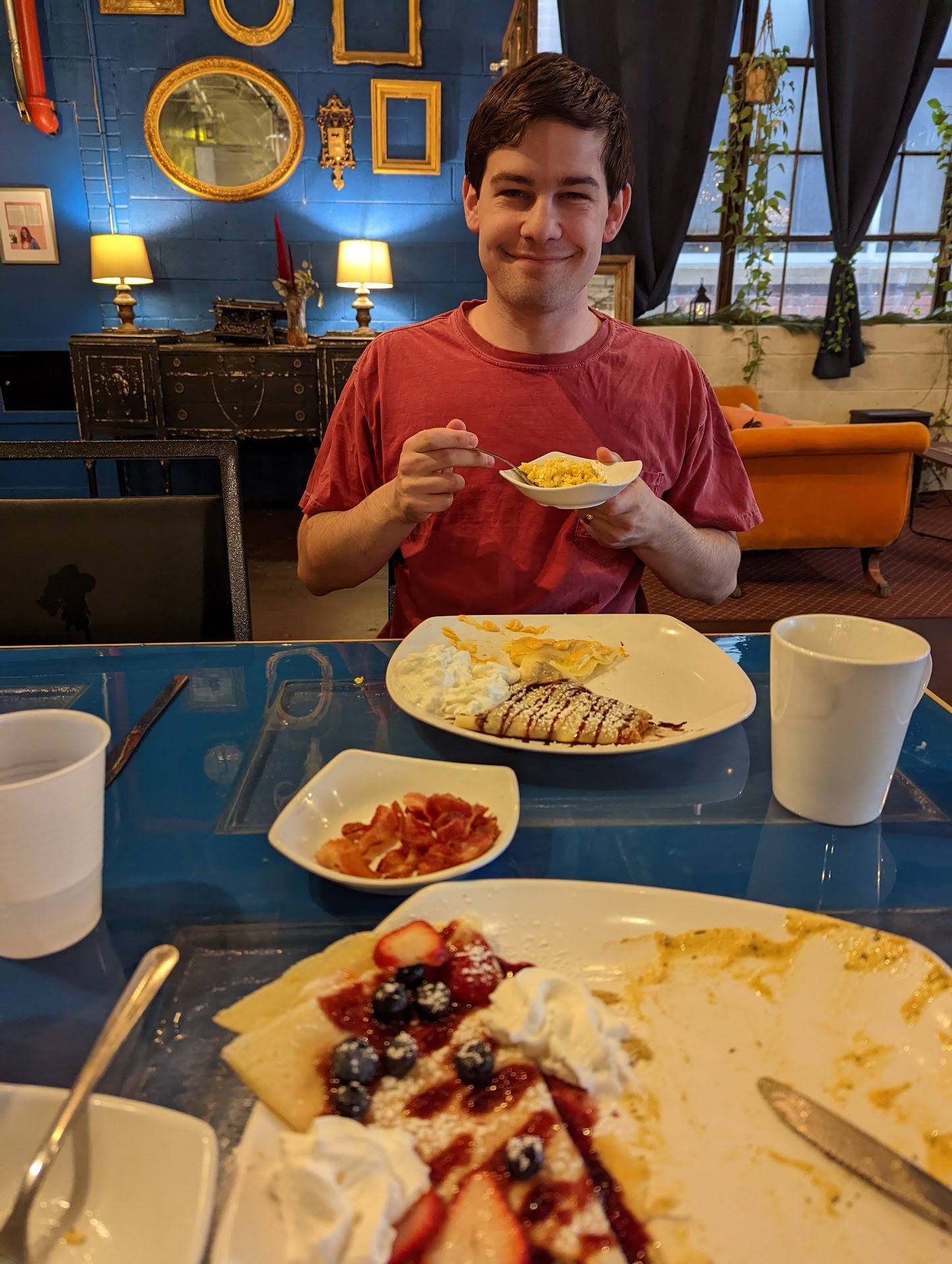 Food- Pretty, but the taste was disappointing. I had the triple berry bliss and Roma crepes, and my husband had the better with bacon and royale. The bacon was low-quality and looked microwaved. The scrambled eggs were weirdly crumbled into tiny pieces. Maybe they cooked them on the crepe station? The berry bliss had a small portion of berries, and it was overly sweet. The Roma was covered in some sort of tangy, hollandaise-esque pesto sauce whose taste overpowered everything else.