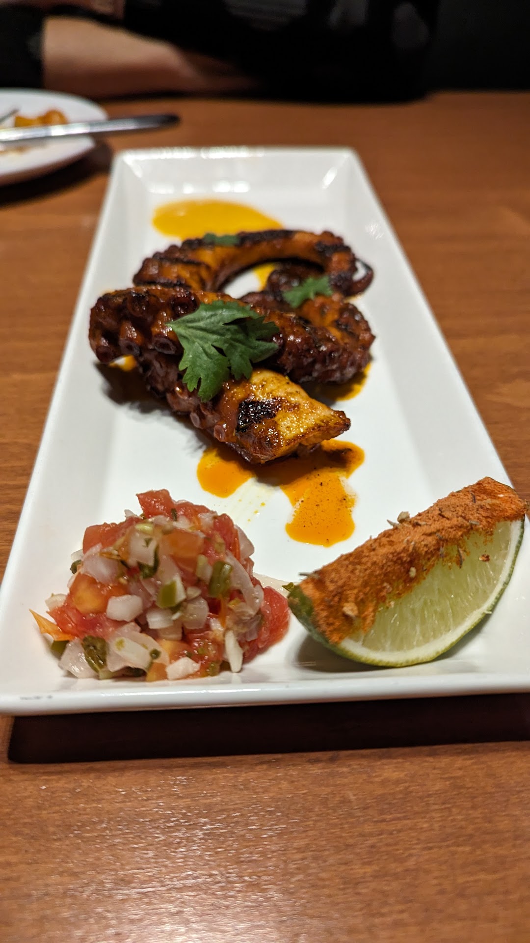 Okay, maybe it's not too far from where everything is, but it is a ways out of the way, and the parking rules in the area were a bit confusing how they were written. I did not see much else in the area for casual people to indulge in, but that is not too much of an issue. Now, the place can be easy to find once you are parked and start walking around. Might be one of the very few places over there that is actually occupied in the evenings. Upon entering, you immediately feel the difference in atmosphere. It is cool, warmly lit, with an open space that feels nice. There was no crowd when my partner and I experienced the place, and we liked the darkened environment for the most part, although it did not feel cozy or welcoming. On the other hand, our server was the one with a warm touch. We were immediately seated, at a very nice corner space at that, with a nice window - although there is not much to look at. The seats are nice and the table is spacious. As we looked over the menus we were given water and I ordered a nice white wine that turned out to be pleasantly subtle. The menu is not overwhelming but presents a good variety of food to choose from. It is simple and pretty basic compared to other menus, but this can be so trivial if the food itself is able to satisfy us more than just filling our bellies. We made our order and waited no more than ten minutes before the tapas started collecting at our table. My grilled octopus was sensational. Considering my only other experience with octopus was disappointing, I had very little for this one. Yet, they surprised me and I was happy with what I was given. Worth the price? Probably not, but I was okay with this, and I liked how it was presented. We shared fried deviled eggs that I found to be the best deviled eggs I've ever tasted in my life. Now, my take should be taken with a grain of salt because I have not tried many compared to my partner, but these were delicious. I would come back just for that. Overall, the experience was delightful. It was not loud, it was not crowded, we were given wonderful service, and as long as you have the change for it you should...