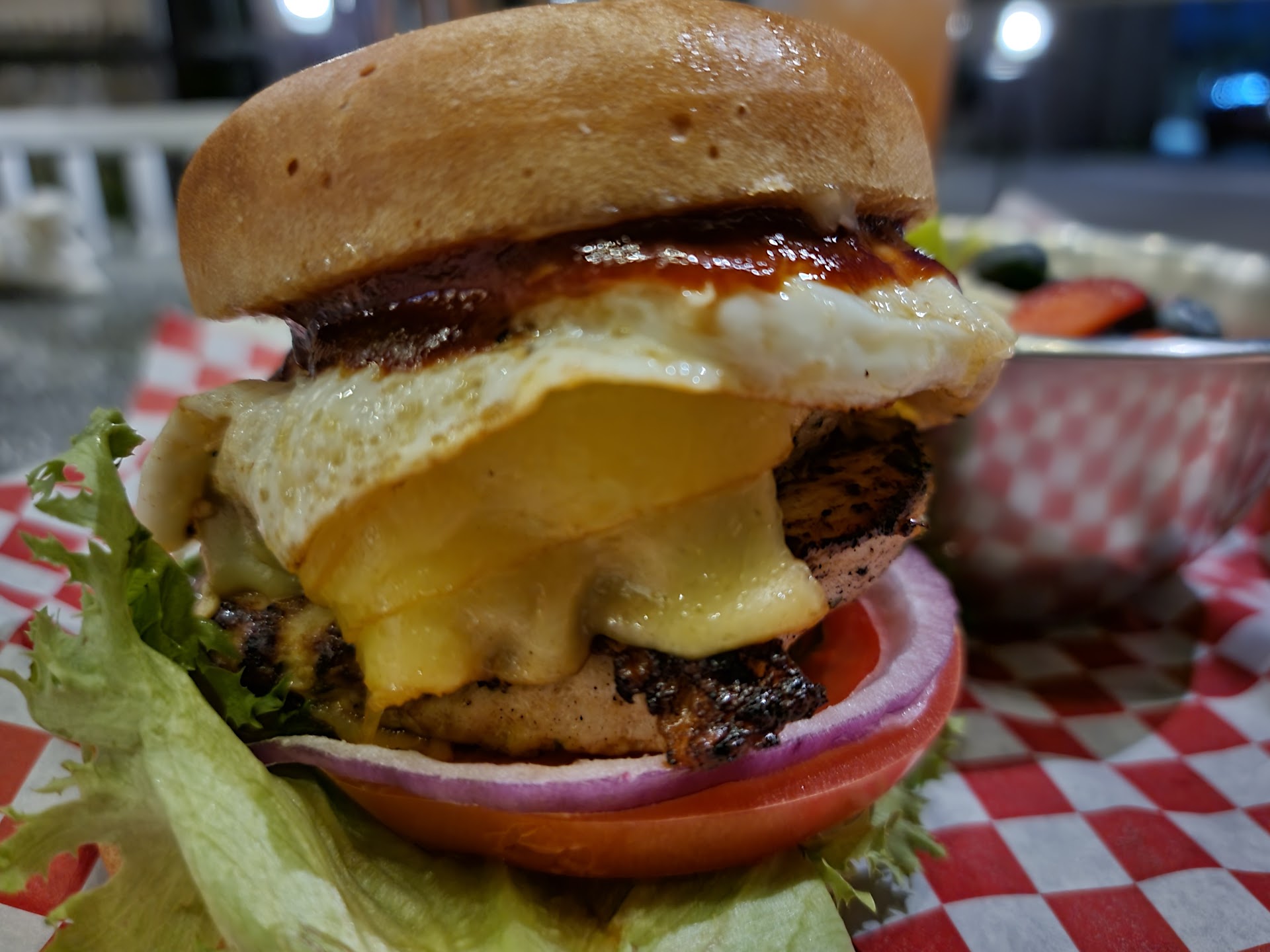 Just look at this juicy, thick, lubious burger đ right here at Bad Daddys Burger bar in Chattanooga, TN. Gluten free buns so you can have any burger which I choice the grilled chicken with BBQ sauce, goude cheese which is rare at restaurants, fried egg on top with real maynaise, lettuce, tomatoes, onions, ketchup, on a gluten free bun. The side I had was fresh fruit and delicious. Even though the options are limited to burgers and salads it was really good. I would rather servers and business be up front about what I can or not have than have a reaction. My server made very sure I had a gluten free meal with exceptional experience. I ordered a strawberry Lemonade that came from the bar with real strawberry slices in my drink. That is pretty sweet. As I walked into the front door I saw to the left the check in desk to be greeted by a smile and asked how many in my party. I requested outside seating under the long canopy. She pleasantly made the accommodations happen. The inside of the restaurant is louder with sports TV's going on the latest games, people laughing having a good time at a table or the large bar to the right of the front door. Lots of cool things on the walls. Like a hood of a old Ford mustang, a lookouts sports jersey that would several minutes to look all over the store. My favorite was going into the men's restroom to see older icon woman on the walls like princess Leia from star Wars, Daisy Duke of the Dukes of Hazzard TV series from the 80's-90's. It was a man cave more than a restroom which was unique and cool to see. Then my food came đłthe burger was so tall my eyes đ grew big. Why cause I was not sure my mouth would fit to take a bite. As you can see from the pictures how yummy it looks and boy was it good. The juicy flavors getting all over my face so be prepared to have one of the many napkins given to you handy cause your going to need it for sure. The grilled chicken was double stacked tender and moist. The fried egg was cooked just right. The smoked goude cheese melted on top of the egg. It was all so good bite by bite. The second burger is beef, mushrooms, cheese with tater tots. I was told they were really good but the tots are not gluten free because they are not done in a dedicated frier. I would highly recommend this restaurant and the food is delicious with excellent quality, taste, and service. I love doing reviews in my home town when here because I travel all over this beautiful nation doing reviews the last two an a half years. Tell them I sent you and follow me as I travel...