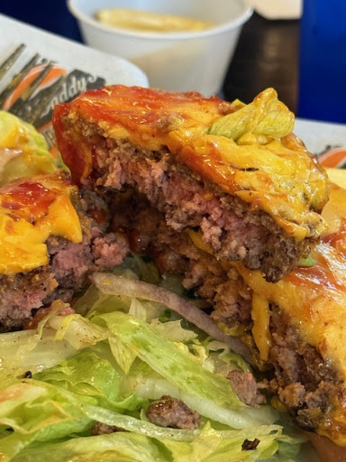 Just look at this juicy, thick, lubious burger đ right here at Bad Daddys Burger bar in Chattanooga, TN. Gluten free buns so you can have any burger which I choice the grilled chicken with BBQ sauce, goude cheese which is rare at restaurants, fried egg on top with real maynaise, lettuce, tomatoes, onions, ketchup, on a gluten free bun. The side I had was fresh fruit and delicious. Even though the options are limited to burgers and salads it was really good. I would rather servers and business be up front about what I can or not have than have a reaction. My server made very sure I had a gluten free meal with exceptional experience. I ordered a strawberry Lemonade that came from the bar with real strawberry slices in my drink. That is pretty sweet. As I walked into the front door I saw to the left the check in desk to be greeted by a smile and asked how many in my party. I requested outside seating under the long canopy. She pleasantly made the accommodations happen. The inside of the restaurant is louder with sports TV's going on the latest games, people laughing having a good time at a table or the large bar to the right of the front door. Lots of cool things on the walls. Like a hood of a old Ford mustang, a lookouts sports jersey that would several minutes to look all over the store. My favorite was going into the men's restroom to see older icon woman on the walls like princess Leia from star Wars, Daisy Duke of the Dukes of Hazzard TV series from the 80's-90's. It was a man cave more than a restroom which was unique and cool to see. Then my food came đłthe burger was so tall my eyes đ grew big. Why cause I was not sure my mouth would fit to take a bite. As you can see from the pictures how yummy it looks and boy was it good. The juicy flavors getting all over my face so be prepared to have one of the many napkins given to you handy cause your going to need it for sure. The grilled chicken was double stacked tender and moist. The fried egg was cooked just right. The smoked goude cheese melted on top of the egg. It was all so good bite by bite. The second burger is beef, mushrooms, cheese with tater tots. I was told they were really good but the tots are not gluten free because they are not done in a dedicated frier. I would highly recommend this restaurant and the food is delicious with excellent quality, taste, and service. I love doing reviews in my home town when here because I travel all over this beautiful nation doing reviews the last two an a half years. Tell them I sent you and follow me as I travel...