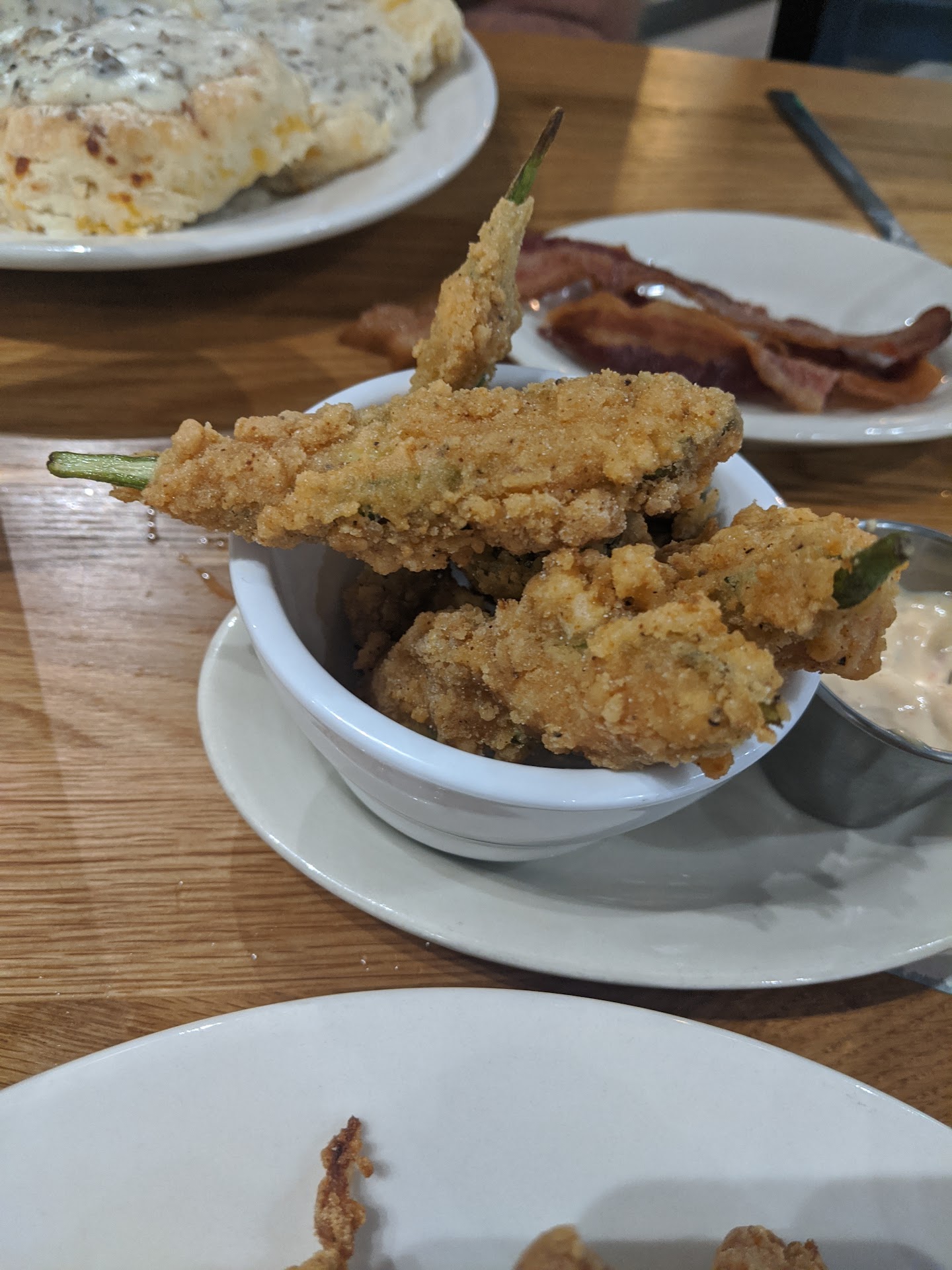 Aug 2020 Food is excellent! Chicken tenders with wasabi honey for dipping, fried okra and jalapenos. Batter is super crispy. Husband had cheddar biscuits and sausage gravy. Biscuits are huge. Good selection of drinks also, recommend the Midnight Bramble and the Blueberry Lemon Drop martini. Great...
