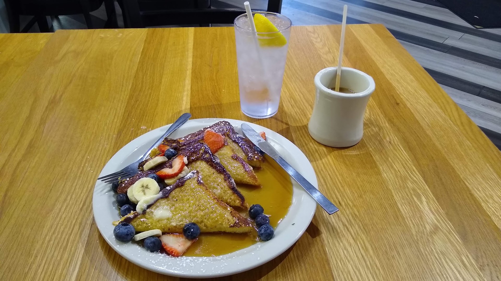 I ordered the french toast, and it was absolutely scrumptious with every mouthful, sprinkled as it was with powdered sugar and fresh blueberries.